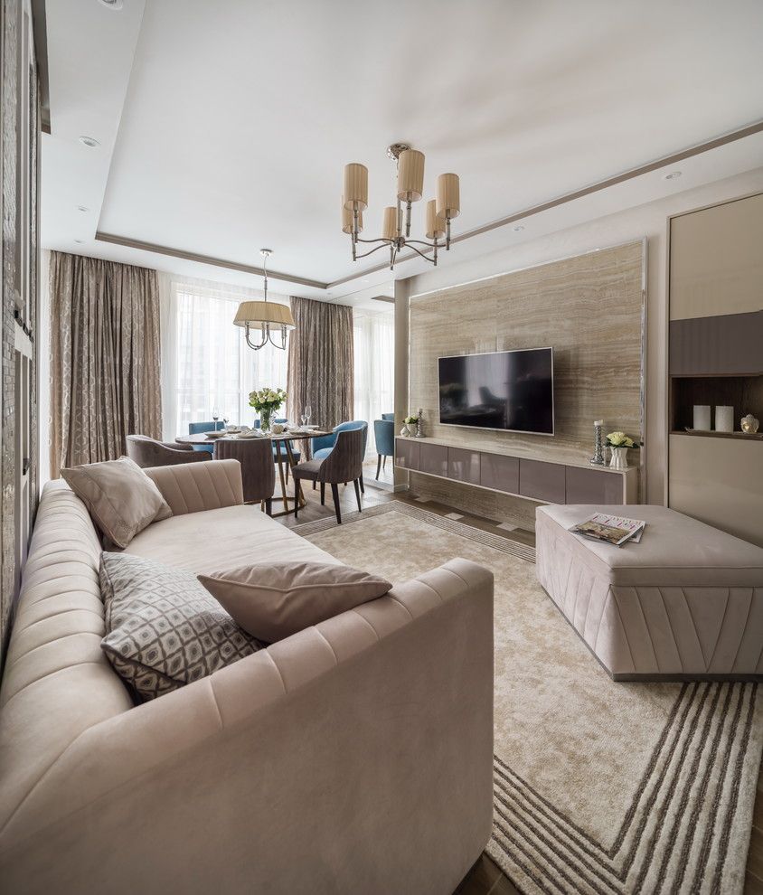 Camera principala se transforma functional in doua incaperi, una cu rol de living si cealalta cu rol de odihna, prin introducerea unui perete despartitor central tapetat si accesorizat pe margini cu mozaic din oglinzi.