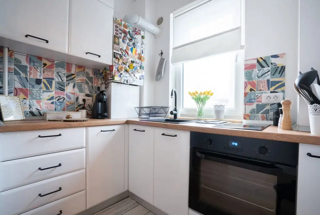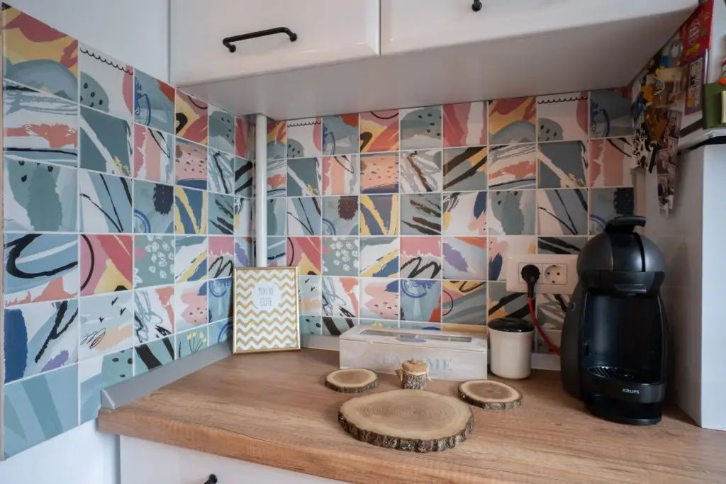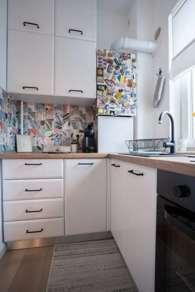 Aici, mobilierul continua linia celorlalte corpuri, pastrand nuanta imaculata de alb si oferind placilor de faianta multicolore posibilitatea de a iesi in evidenta.