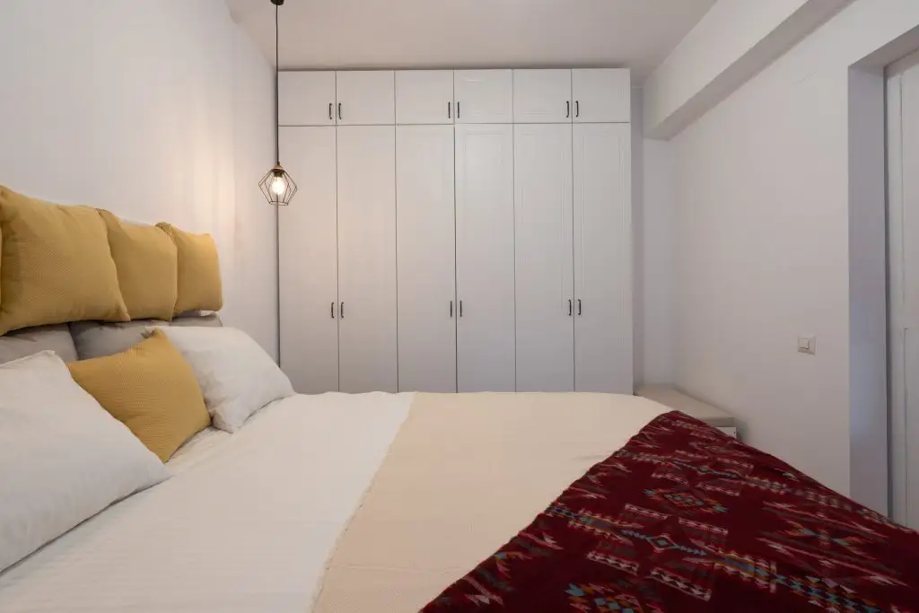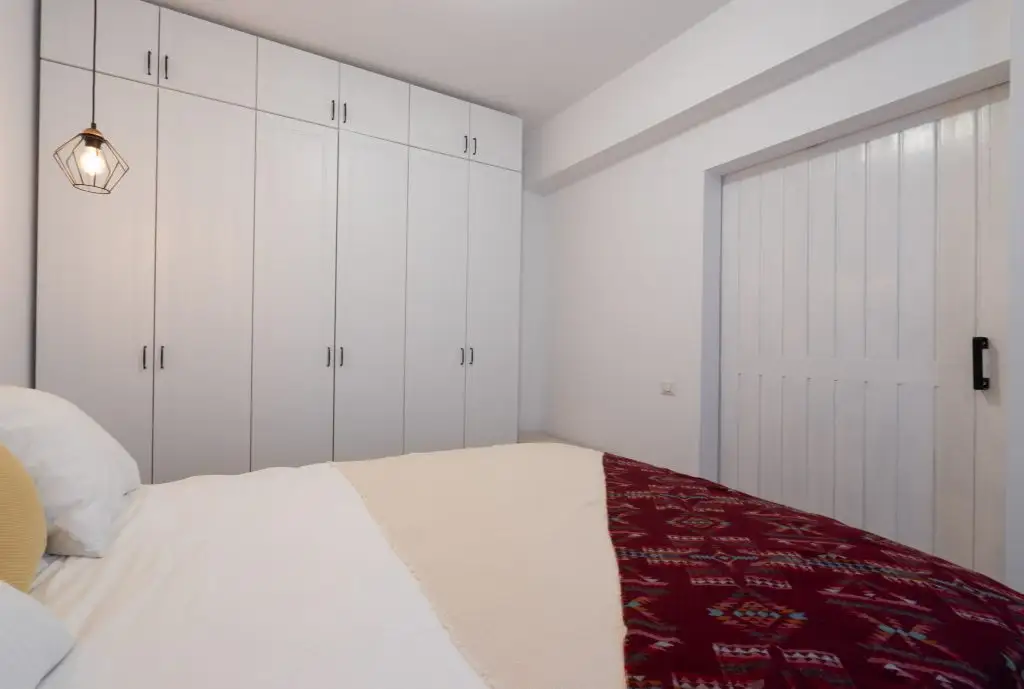 Dormitorul este unul minimalist, in culori deschise, compus dintr-un pat dublu central, un dressing pe tot peretele si un dulap cu spatii de depozitare deschise. Corpurile de iluminat moderne impreuna cu draperia inchisa la culoare, ofera posibilitatea aducerii in prim-plan a unei atmosfere de relaxare intr-un cadru intim.In spatele unei usi moderne din sticla se regaseste bucataria.