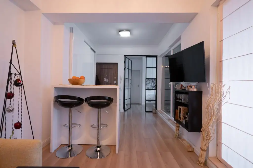 Alegerea unui parchet deschis la culoare atat in linving, cat si in bucatarie si dormitor, ofera continuitate intregului spatiu si ii asigura un efect de marire din punct de vedere vizual.