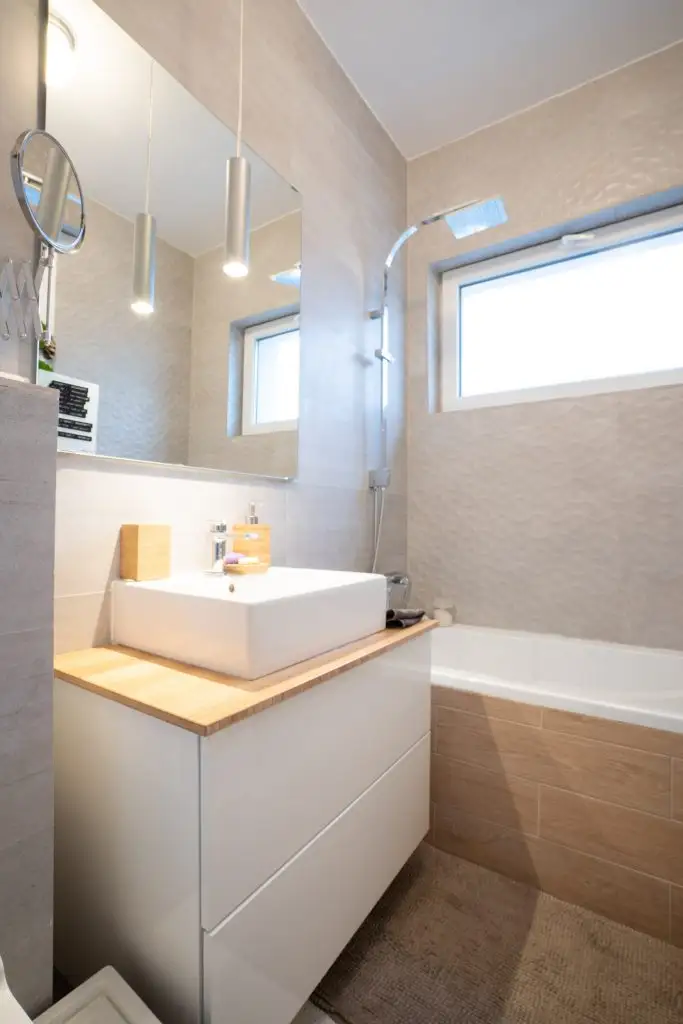 In cazul baii, simplitatea si naturaletea sunt cele doua puncte forte. Beige-ul, lemnul natural si accentele de verde, dau senzatia de prospetime si maresc vizual intreaga incepere. In ceea ce priveste corpurile sanitare si componentele de iluminat artificial, abstractul modern este cel care isi pune amprenta, conturand intr-o maniera minimalista un spatiu functional si relaxant.
