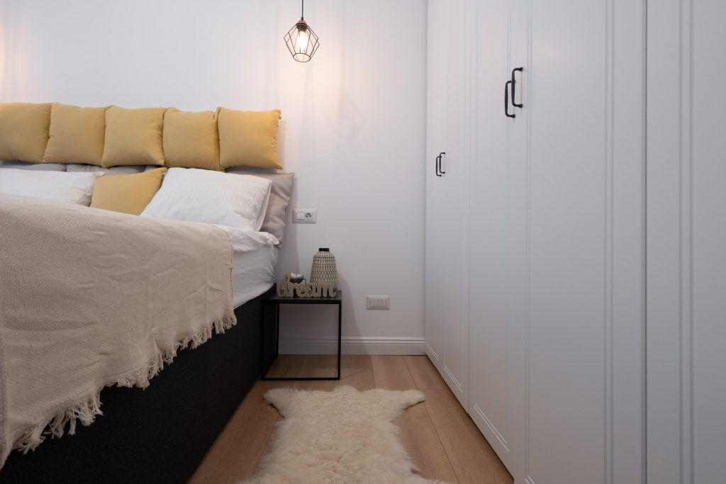 Dormitorul este unul minimalist, in culori deschise, compus dintr-un pat dublu central, un dressing pe tot peretele si un dulap cu spatii de depozitare deschise. Corpurile de iluminat moderne impreuna cu draperia inchisa la culoare, ofera posibilitatea aducerii in prim-plan a unei atmosfere de relaxare intr-un cadru intim.In spatele unei usi moderne din sticla se regaseste bucataria.