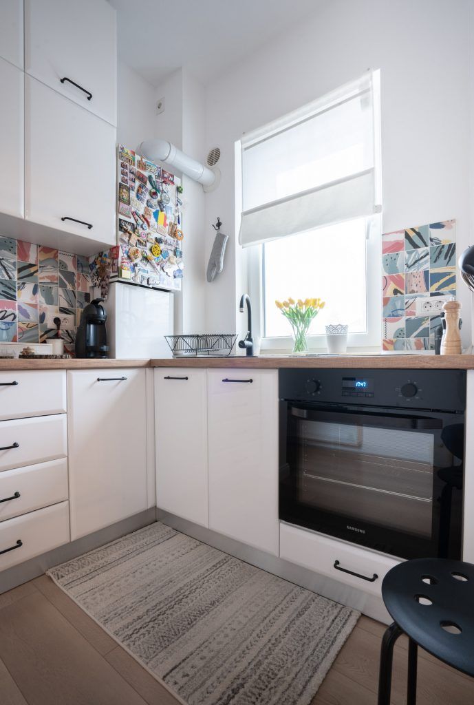Aici, mobilierul continua linia celorlalte corpuri, pastrand nuanta imaculata de alb si oferind placilor de faianta multicolore posibilitatea de a iesi in evidenta.
