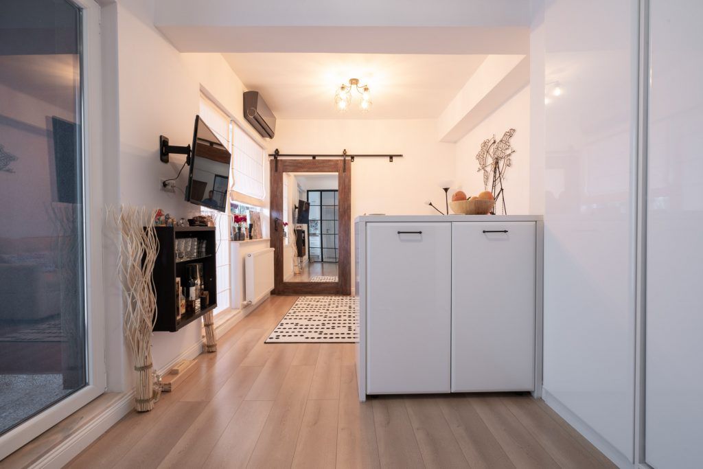 Alegerea unui parchet deschis la culoare atat in linving, cat si in bucatarie si dormitor, ofera continuitate intregului spatiu si ii asigura un efect de marire din punct de vedere vizual.