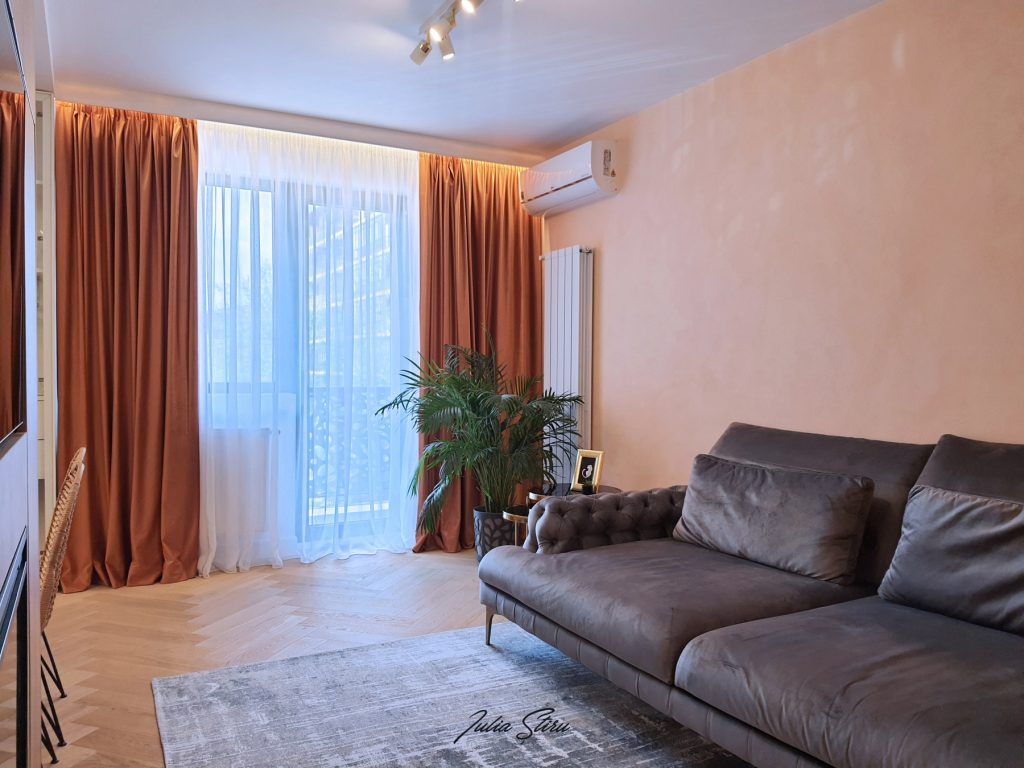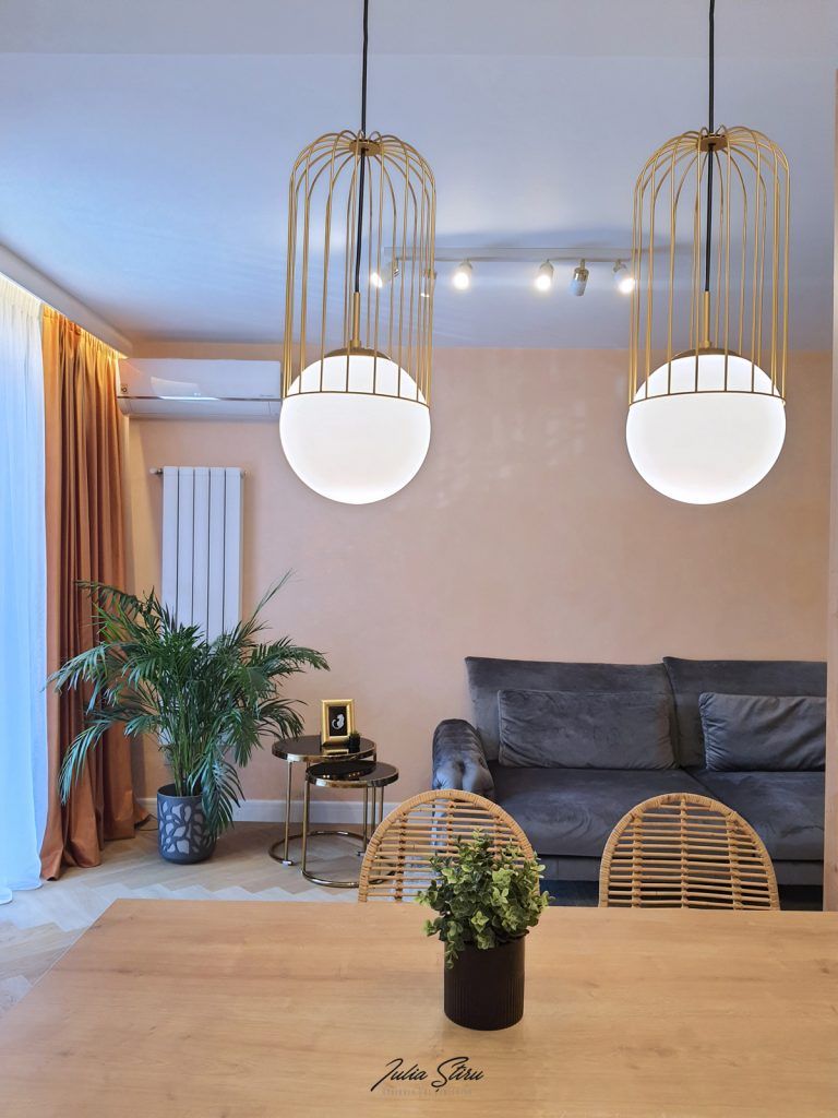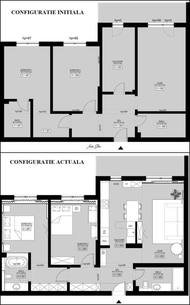 Apartamentul de trei camere dispune de 2 bai, bucatarie si hol de distributie generos. A fost preluat de echipa de arhitectura de interior Iulia Stiru in stadiul la gri, avand la dispozitie un buget de 45000 de euro pentru a transforma aceasta proprietate imobiliara in acel “acasa” mult dorit.