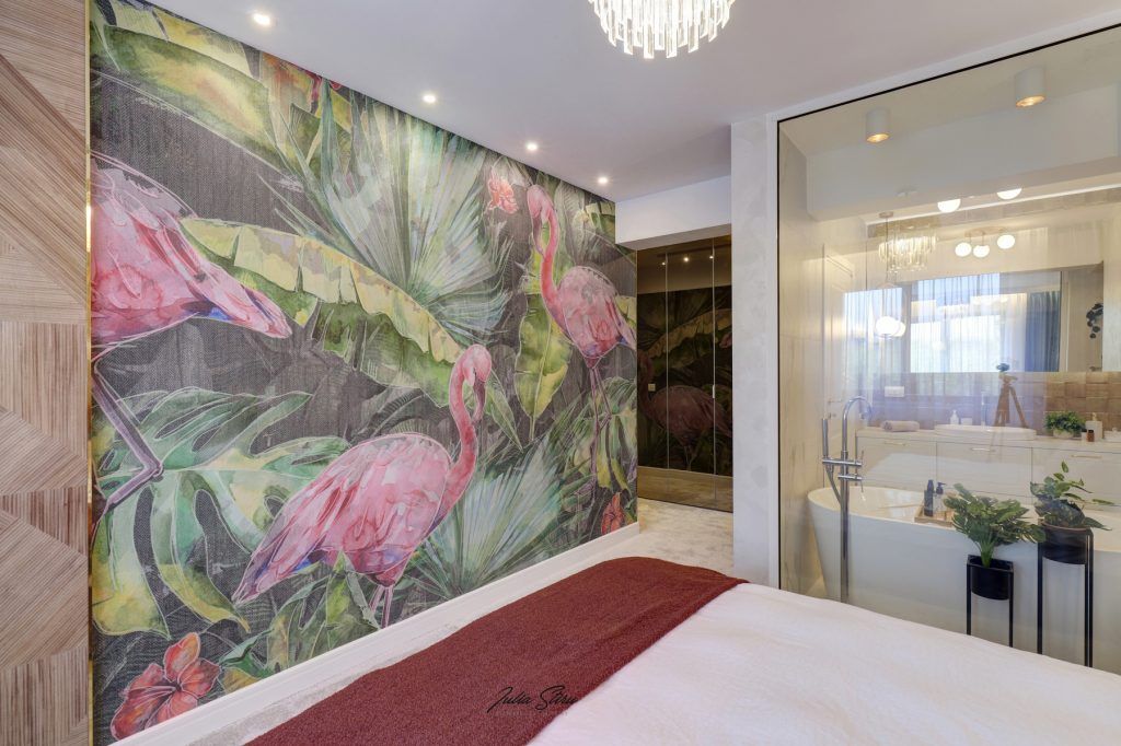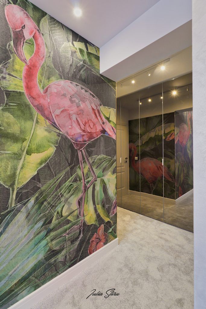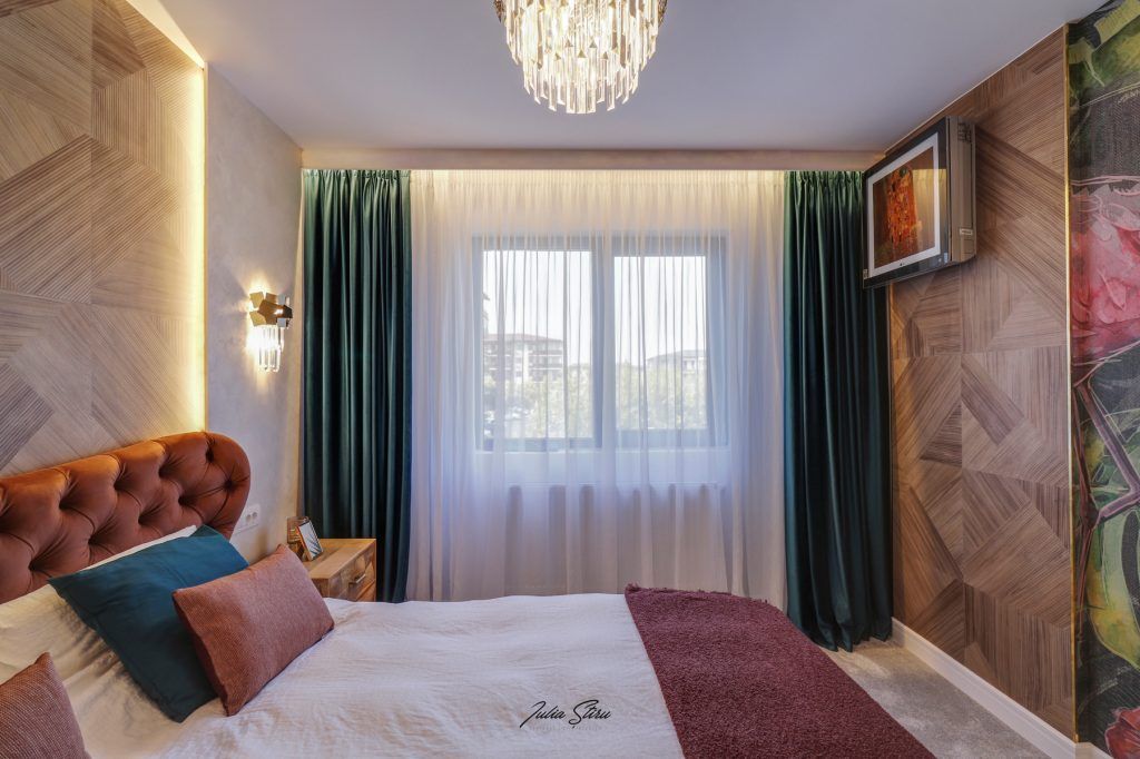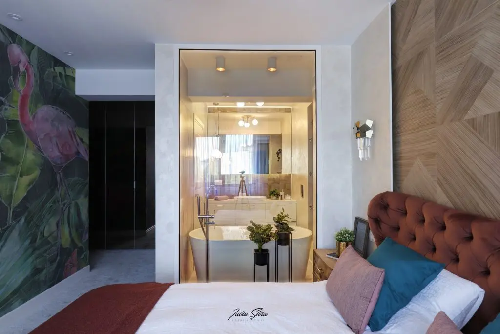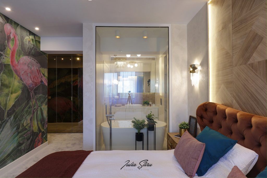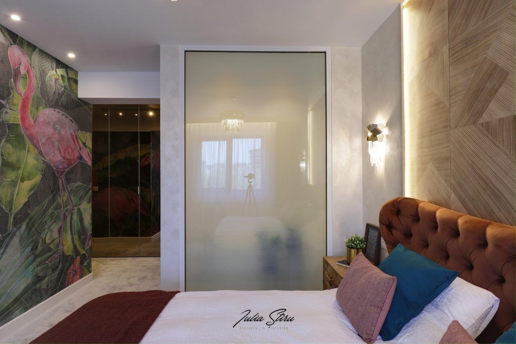 Dormitorul matrimonialcontinua linia stilistica a intregului concept, insa este zona cu cel mai mare impact din cadrul amenajarii. Tapetul cu model exotic si culori vibrante creeaza o atmosfera joviala, placuta in contextul modern al amenajarii.