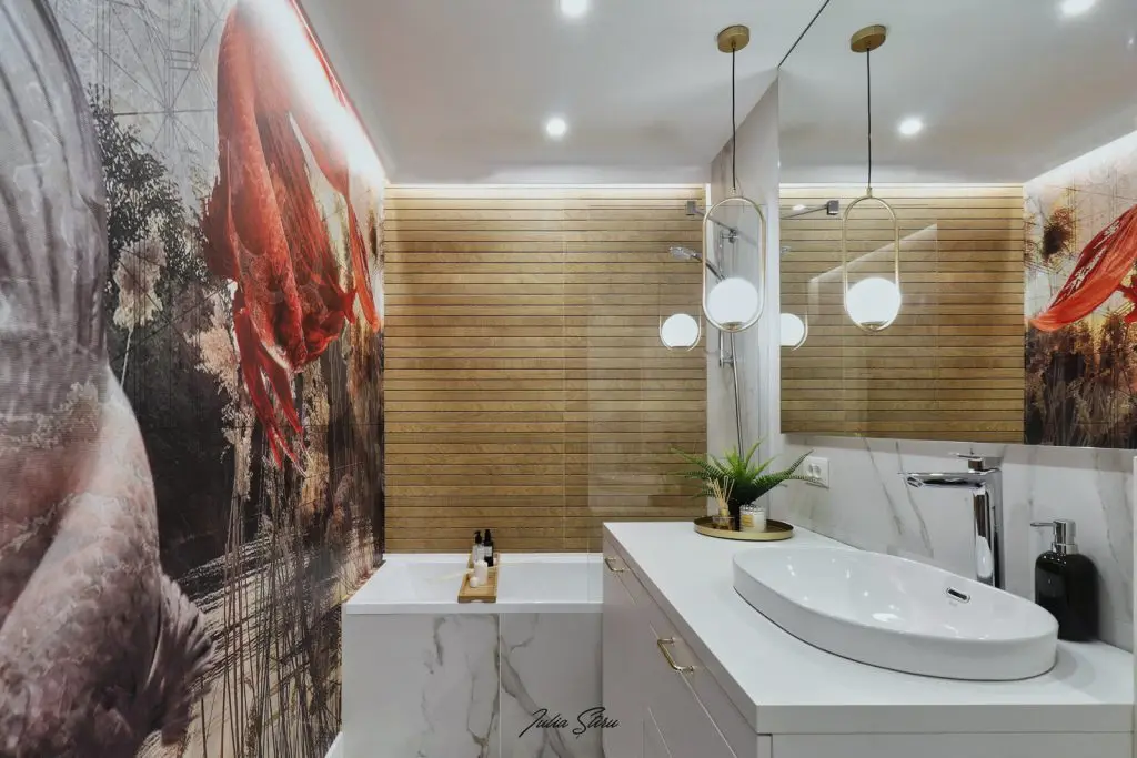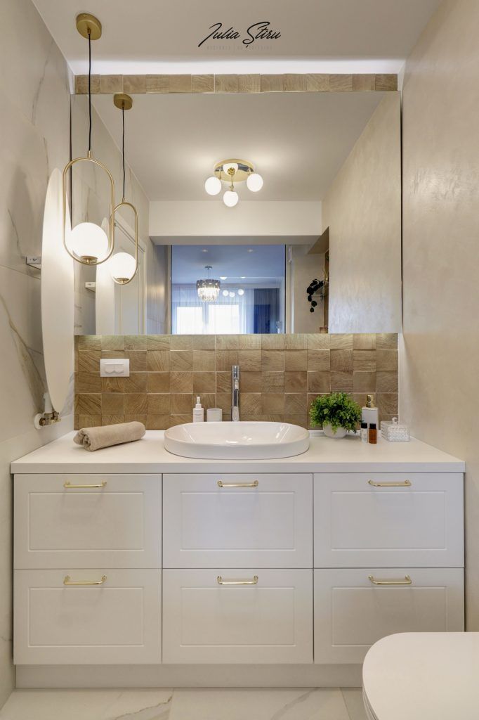 “Acest tip de tapet este unul special pentru baie, pe care am ales sa-l evidentiem cu o sursa de iluminat dedicata. Totodata, in zona lavoarului am realizat o oglinda customizata de dimensiuni generoase pentru a se reflecta o mare parte din tapet. “