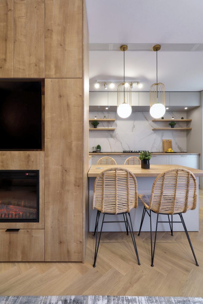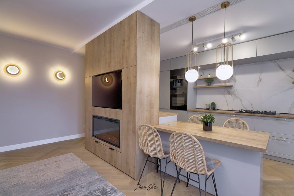 Peretele din living (comun cu bucataria) a fost placat cu lemn pe toate laturile, avand o aparenta robusta, solida, un suport optim pentru televizor si semnieul electric incastrat.