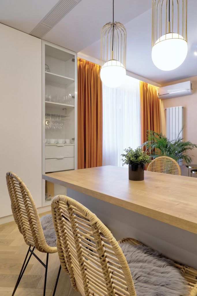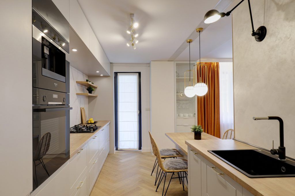 Bucataria initiala avea o configuratie clasica de bloc, forma dreptunghiulara, spatiu ingust. A fost adaptata cu succes la personalitatea sociabila a proprietarilor printr-o serie de modificari: eliminarea partiala a peretelui comun cu livingul; optimizarea zonei de gatit si de relaxare, zona de chiuveta a ramas ascunsa, asigurand intimitatea necesara.