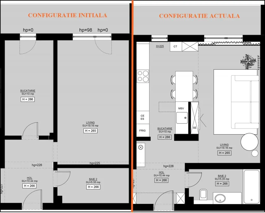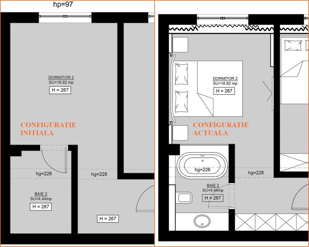 Parcursul amenajarii a fost unul complex, incluzand refacerea instalatiei electrice, repozitionare trasee obiecte sanitare, mascarea tevii de gaz, refacerea plafonului din gipscarton pentru a asigura o izolare fonica optima.
