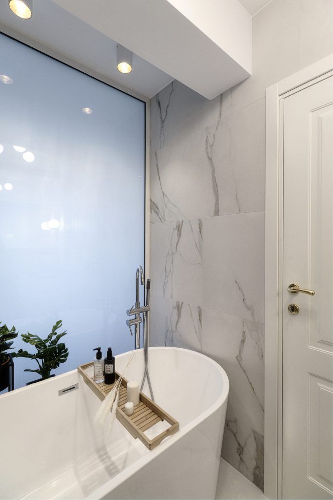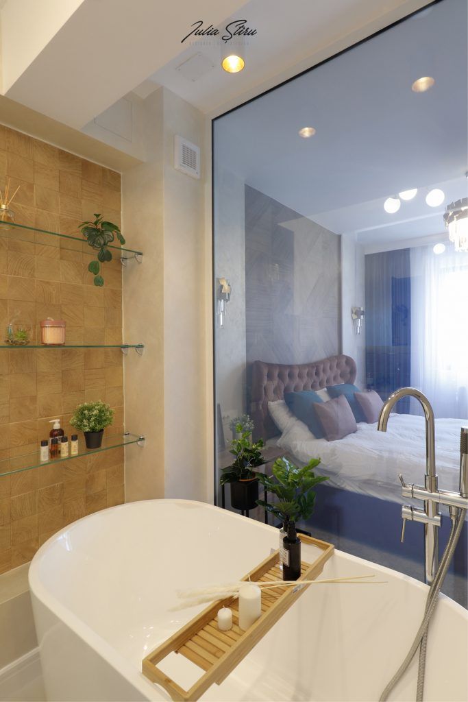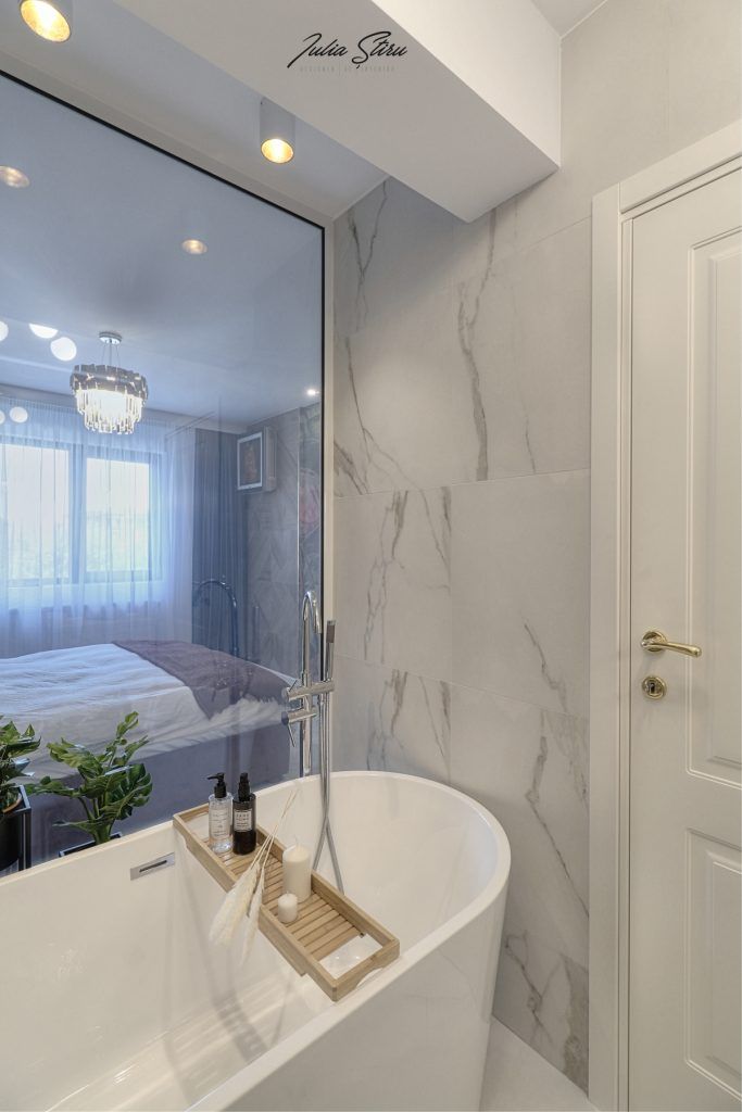 Baia matrimoniala a fost reconfigurata; pentru o mai buna optimizare a spatiului au decis sa mute usa de intrare in baie, iar peretele catre dormitor a fost inlocuit de un panou mare de sticla inteligenta care poate deveni oricand opaca, la o simpla apasare de buton. Astfel, baia beneficiaza acum si de lumina naturala care patrunde in dormitor.