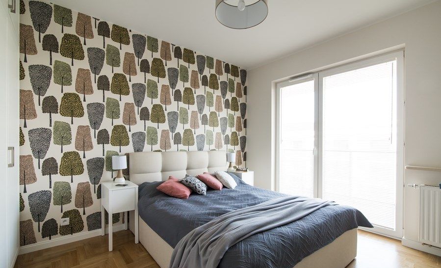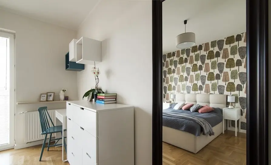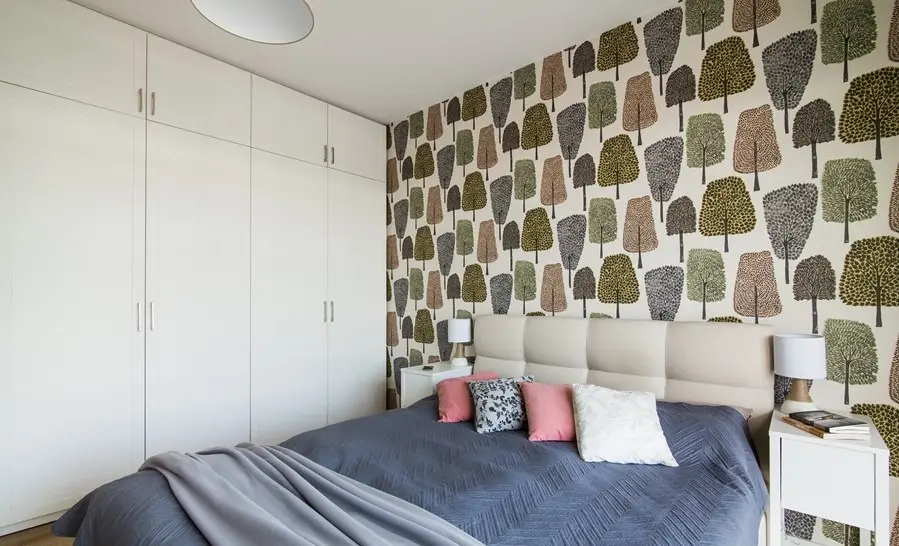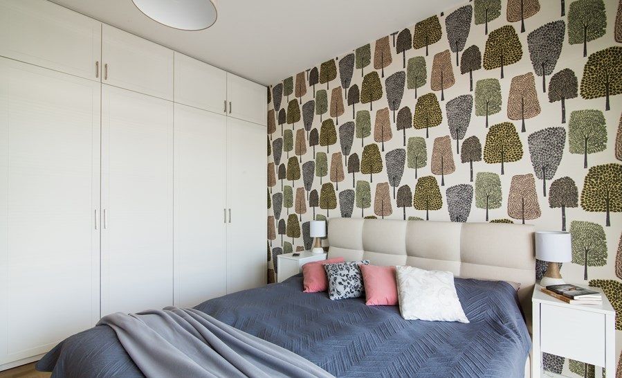 Linia designului nordic o regasim si in dormitor. Folosind un tapet cu un imprimeu colorat, a fost conturata o zona de accent in dreptul patului. Tablia este tapitata si asigura un confort sporit. Pentru a asigura o cat mai buna depozitare, s-a optat pentru dulapuri inalte, pana in tavan, de asemenea, cu front alb. Decorul obtinut este placut si primitor.