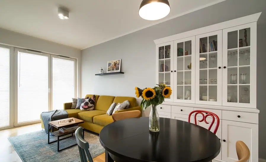 Apartamentul este unul de doua camere cu o suprafata de 65 metri patrati. Bugetul cu care au pornit nu a fost unul foarte generos, asa ca au optat pentru solutii simple, dar functionale pentru a contura un camin primitor si confortabil.