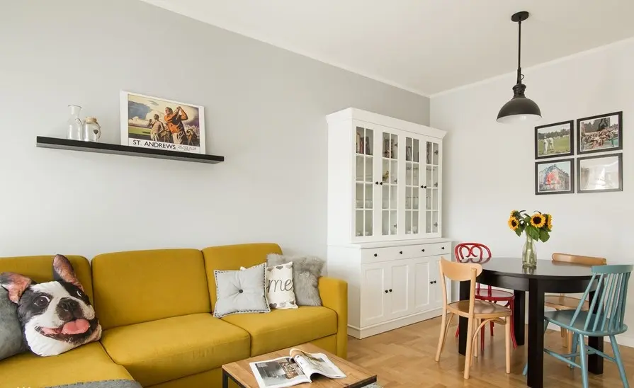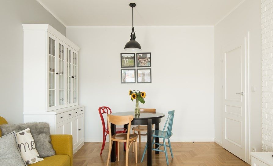 Pentru ca bucataria nu ofera prea mult spatiu, au dorit un loc de luat masa pe care l-au integrat in cadrul livingului. Au adaugat si un corp de mobilier tip bufet in apropierea mesei pentru a reda coerent o astfel de zona. Scaunele colorate si corpul de iluminat suspendat ofera un plus de interes spatiului.