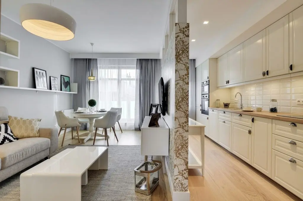 Delimitarea intre cele doua zone se realizeaza la nivelul pardoselii. Regasim o paleta cromatica usoara, simpla si curata unde actorul principal este albul (non-culoare) in combinatie cu nuante calde de crem si gri. Living-ul pastreaza tematica moderna imbinata cu stilul nordic iar piesele principale ce o compun sunt: o masuta de cafea, o canapea confortabila si cateva rafturi suspendate.