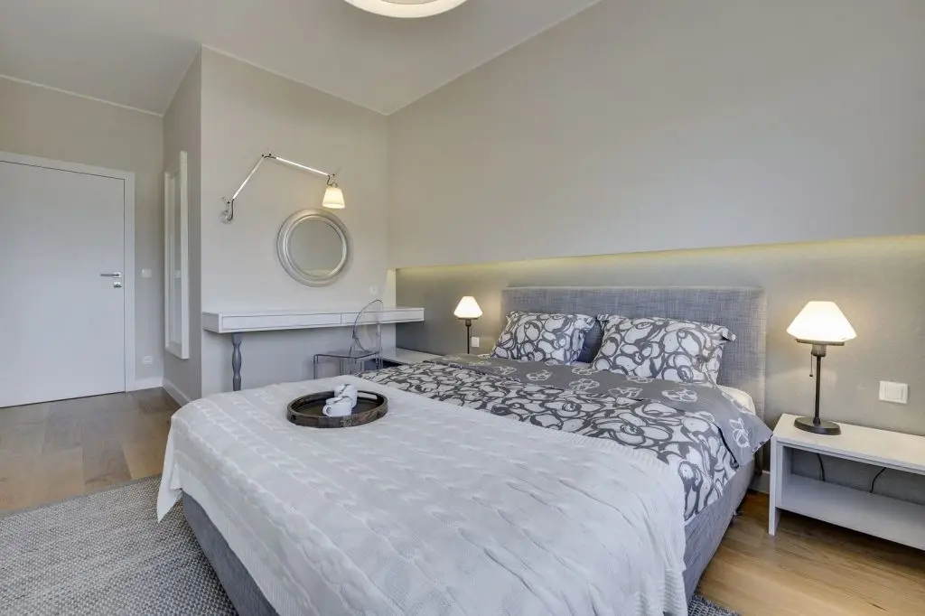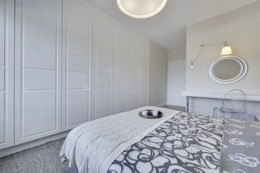 In dormitor se continua mixul dintre alb, crem, gri si lemn. Un punct de interes este patul ce impresioneaza prin confortul oferit de generozitatea lui si a texturilor alese. Corpurile de iluminat vin in completarea unei atmosfere intime. In fata patului, pe intreg peretele nu putem sa nu remarcam dressing-ul, cu un vast spatiu dedicat depozitarii.
