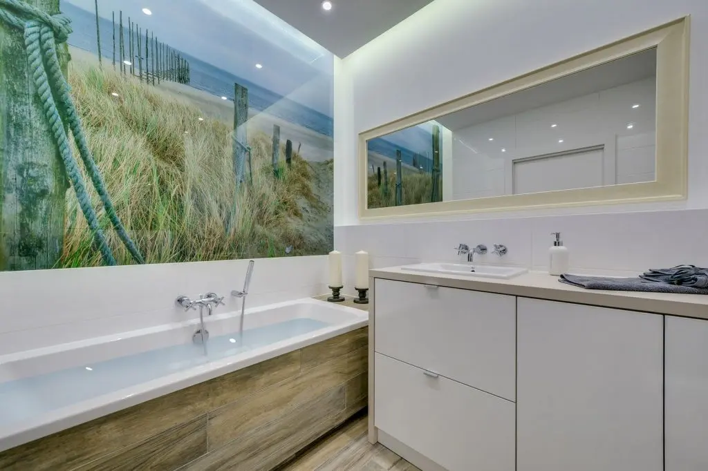 Baia pastreaza echilibru intre functionalitate si relaxare. Ne bucuram de aceesi continuitate din punct de vedere stilistic si cromatic. Abundenta albului alaturi de lemn si elemente indraznete valorifica si transforma intreg spatiul. Putem spune ca tapetul cu tematica din natura, inveseleste decorul iar efectul de marire al spatiului este bine punctat cu ajutorul luminii artificiale si al oglinzilor.