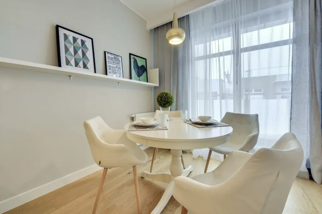 Motivele geometrice ce se regasesc pe pernele decorative creeaza un impact pozitiv in mediul locuintei. Un punct de interes poate fi si dining-ul prin introducerea in decor a tablourilor artistice si prin corpul de iluminat suspendat. Lumina naturala patrunde prin perdeaua alba, usor transparenta, oferind luminozitate spatiului iar draperiile gri contrasteaza cu mobila si parchetul.