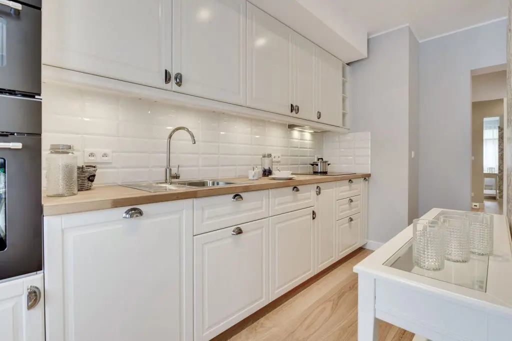 Bucataria, lunga si ingusta, este simplista cu un mobilier minimalist pe o singura latura, potrivit acestui spatiu nu foarte generos. Albul este omniprezent si reuseste sa amplifice vizual suprafata iar electrocasnicele sunt incorporate pentru un plus de ordine si unitate.