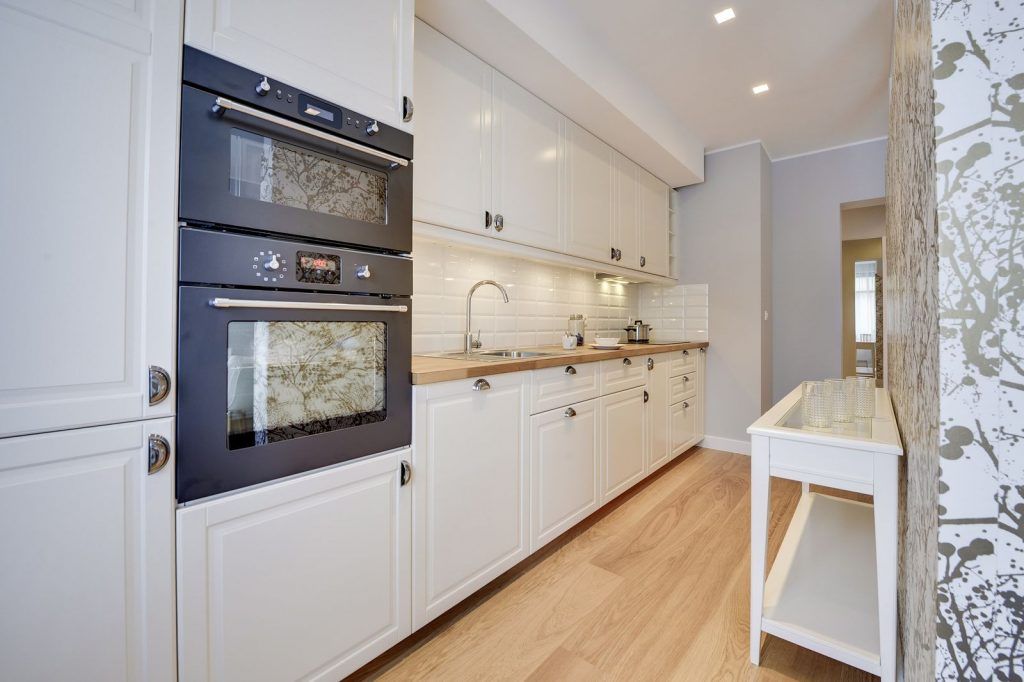 Bucataria, lunga si ingusta, este simplista cu un mobilier minimalist pe o singura latura, potrivit acestui spatiu nu foarte generos. Albul este omniprezent si reuseste sa amplifice vizual suprafata iar electrocasnicele sunt incorporate pentru un plus de ordine si unitate.