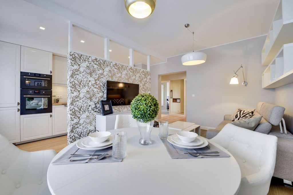 Motivele geometrice ce se regasesc pe pernele decorative creeaza un impact pozitiv in mediul locuintei. Un punct de interes poate fi si dining-ul prin introducerea in decor a tablourilor artistice si prin corpul de iluminat suspendat. Lumina naturala patrunde prin perdeaua alba, usor transparenta, oferind luminozitate spatiului iar draperiile gri contrasteaza cu mobila si parchetul.