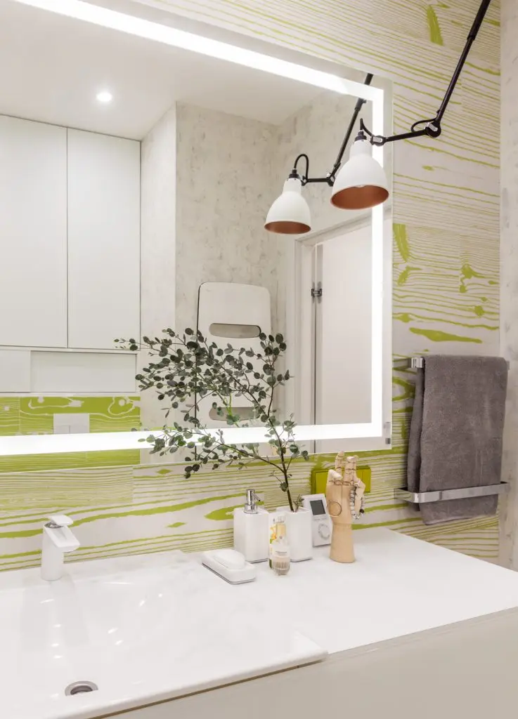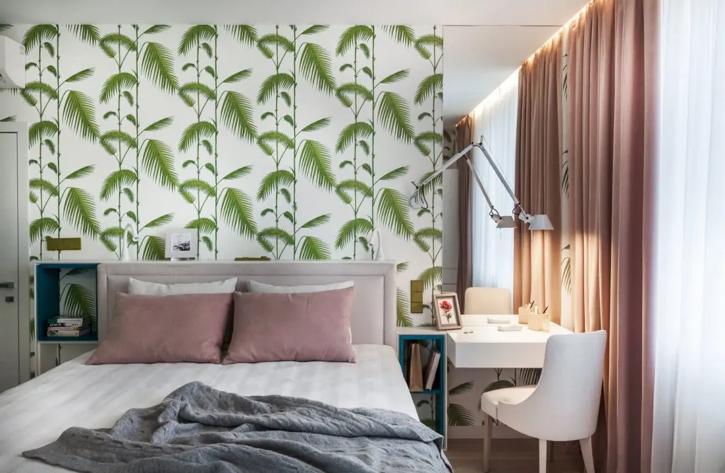 Accentele de culoare sunt nelipsite si din dormitorul parintilor, accente ce apar la nivelul peretilor sub forma de tapet cu motive vegetale, reusind sa ofere prospetime si o nota personalizata. Mobilierul se compune dintr-un pat de mijloc tapitat, 2 noptiere asimetrice dispuse de o parte si de alta a patului si un corp cu multe sertare pentru depozitare. Langa fereastra a fost amenajat un loc special pentru masa de toaleta, cu oglinda inalta (pana la nivelul plafonului) si o veioza cu brat reglabil.