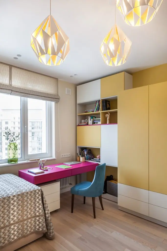 Dormitorul fetelor, la randul lui, isi primeste doza energizanta prin peretele accent cu galben si a mobilei facute la comanda. Un alt element ce iese in evidenta este corpul de iluminat ce ajuta la obtinerea unei imagini de ansamblu mult mai interesanta. Restul decorului este completat cu nuante deschise de crem, gri si lemn, care echilibreaza si armonizeaza intregul spatiu.