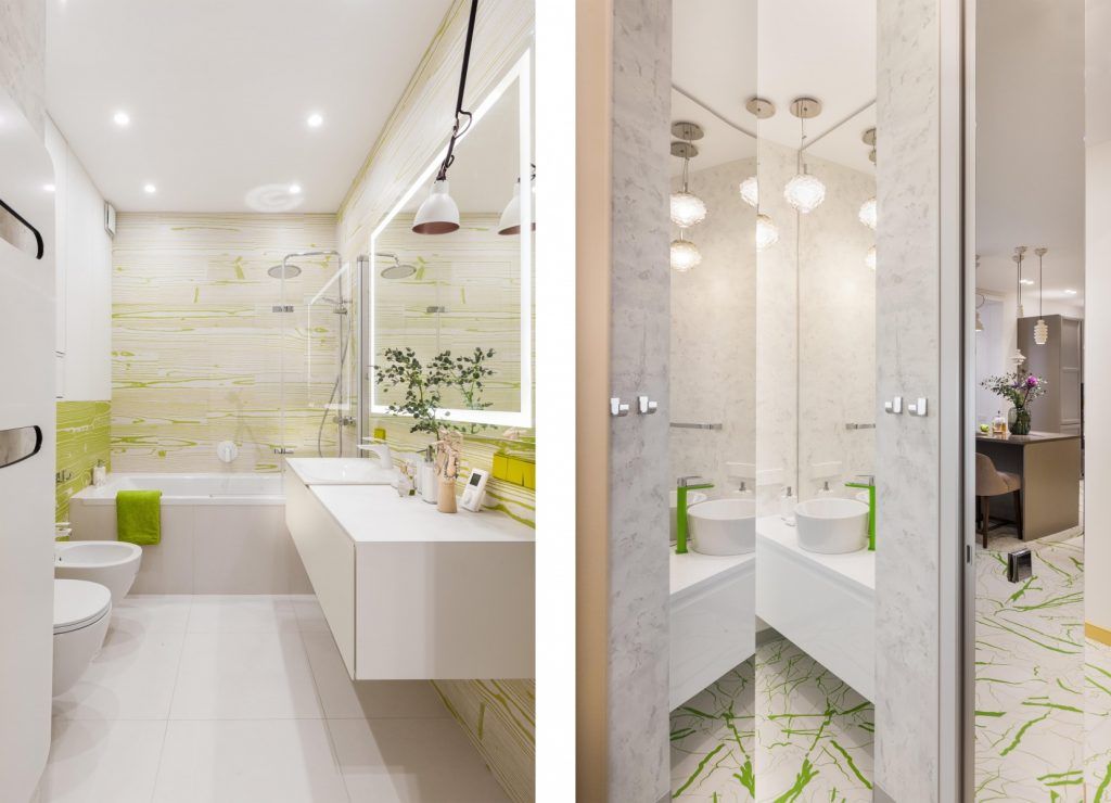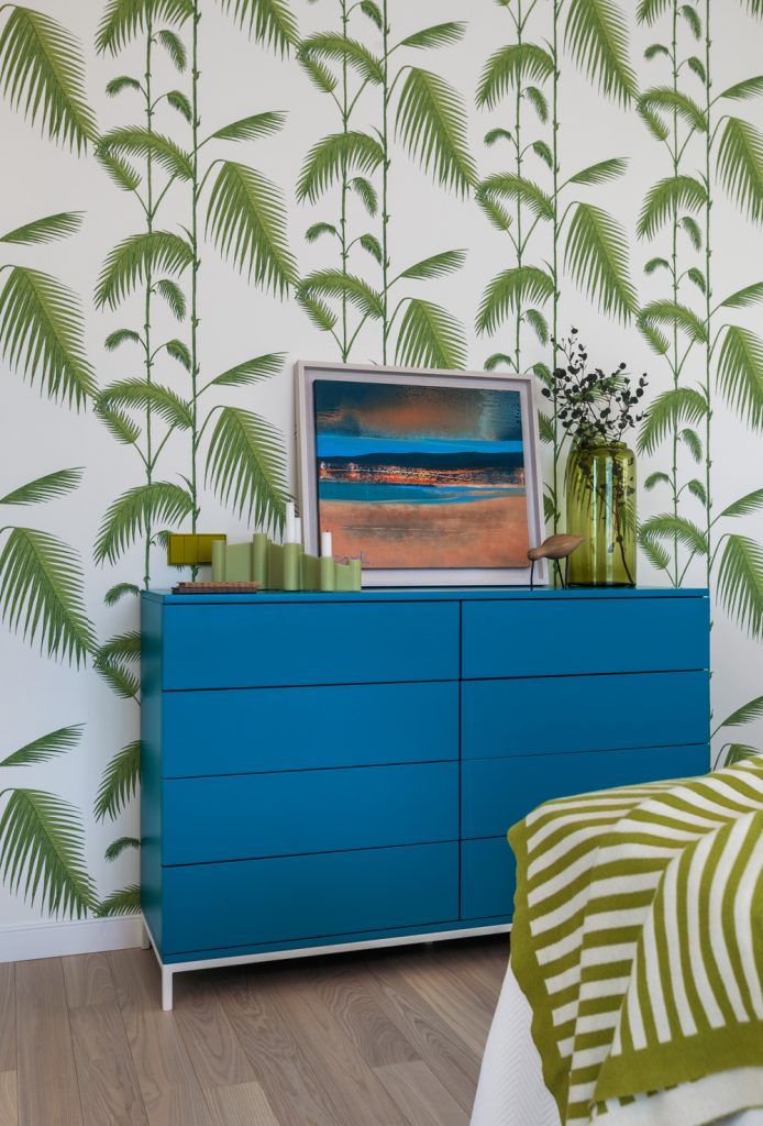 Accentele de culoare sunt nelipsite si din dormitorul parintilor, accente ce apar la nivelul peretilor sub forma de tapet cu motive vegetale, reusind sa ofere prospetime si o nota personalizata. Mobilierul se compune dintr-un pat de mijloc tapitat, 2 noptiere asimetrice dispuse de o parte si de alta a patului si un corp cu multe sertare pentru depozitare. Langa fereastra a fost amenajat un loc special pentru masa de toaleta, cu oglinda inalta (pana la nivelul plafonului) si o veioza cu brat reglabil.