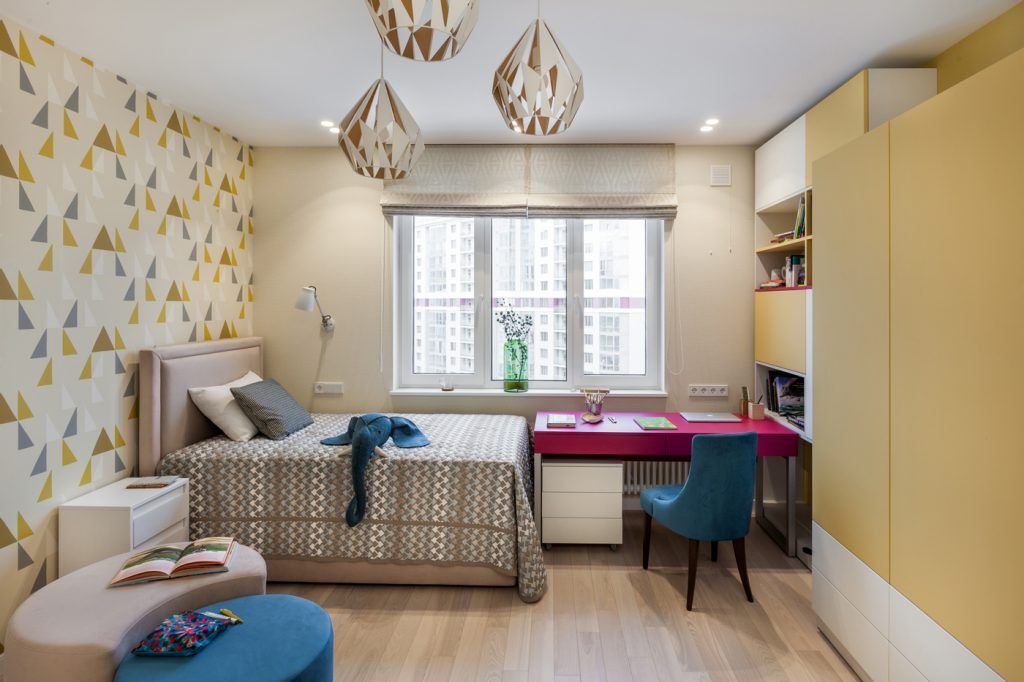 Dormitorul fetelor, la randul lui, isi primeste doza energizanta prin peretele accent cu galben si a mobilei facute la comanda. Un alt element ce iese in evidenta este corpul de iluminat ce ajuta la obtinerea unei imagini de ansamblu mult mai interesanta. Restul decorului este completat cu nuante deschise de crem, gri si lemn, care echilibreaza si armonizeaza intregul spatiu.