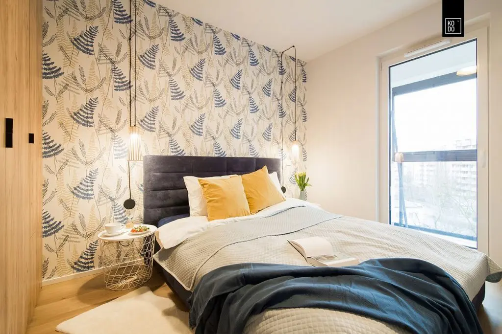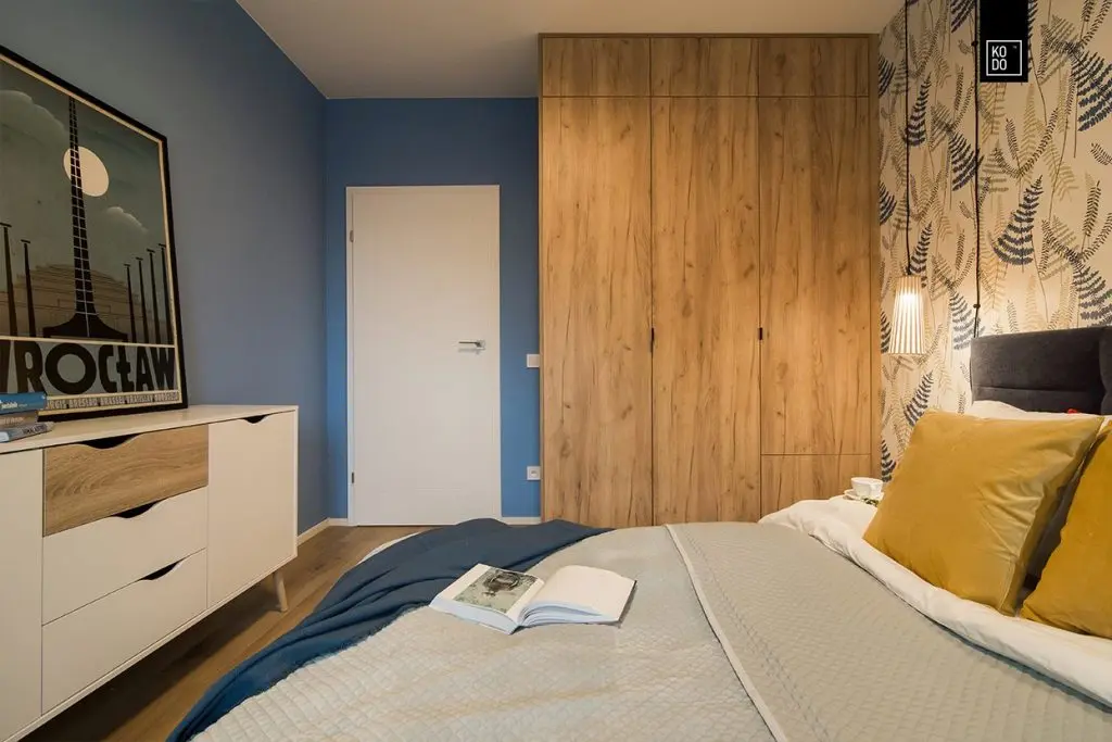 Daca in zona de zi avem culori vibrante si multe energie, in dormitorul matrimonial lucrurile se mai calmeaza putin. Albastrul folosit pentru pereti este mai sters iar culoarea lemnului pastreaza un ambient relaxant potrivit unei zone de noapte. Nici peretele accent nu este incarcat de culori, tocmai pentru a mentine aceasta atmosfera relaxanta.