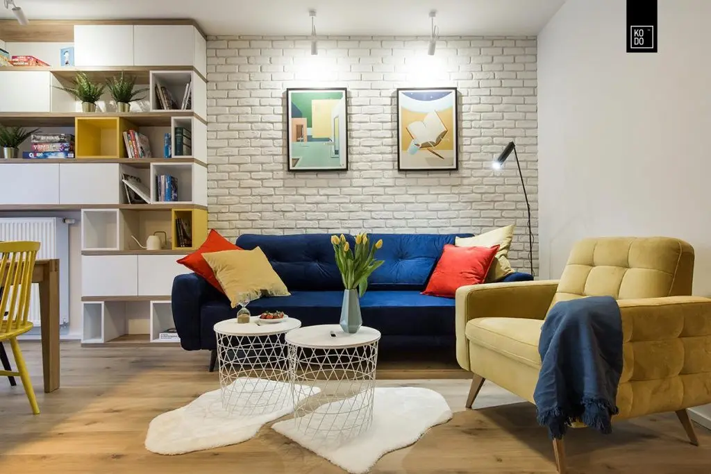 In living, pe langa culorile expresive designerii au optat si pentru motivul geometric, reprezentat atat prin peretele de caramida aparenta cat si prin mobilierul sub forma unor cuburi colorate.
