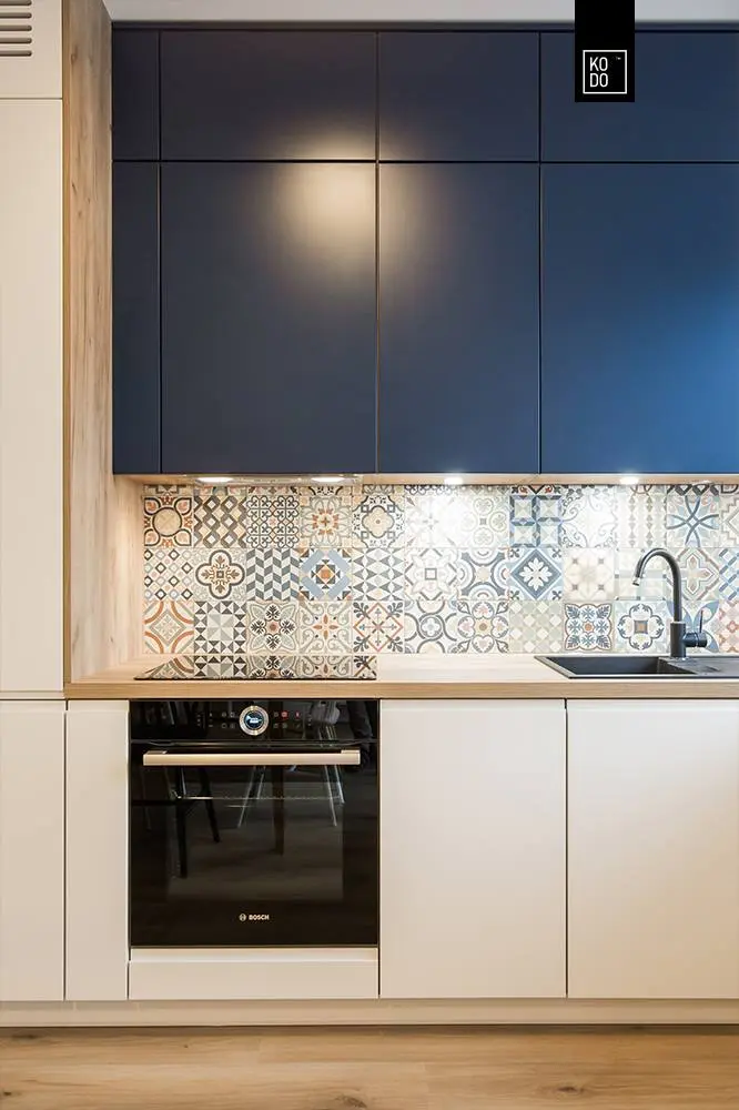 Bucataria este dispusa sub forma literei L si vine ca o prelungire a zonei de zi. Corpurile principale de mobilier au un design minimalist iar electrocasnicele au fost incorporate pentru a pastra unitatea vizuala, inclusiv frigiderul. Aici monotonia a fost sparta de albastrul folosit la corpurile suspendate. Spatiul se bucura si de multa lumina naturala datorita ferestrei existente.