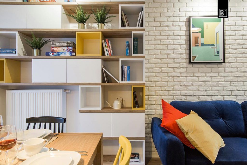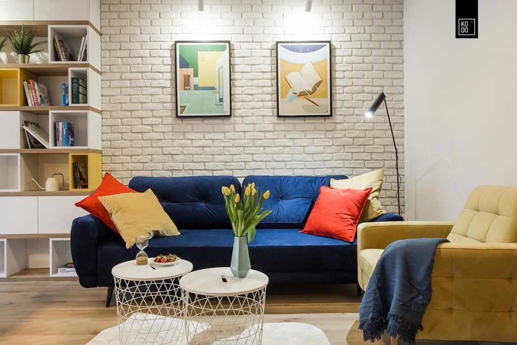 In living, pe langa culorile expresive designerii au optat si pentru motivul geometric, reprezentat atat prin peretele de caramida aparenta cat si prin mobilierul sub forma unor cuburi colorate.