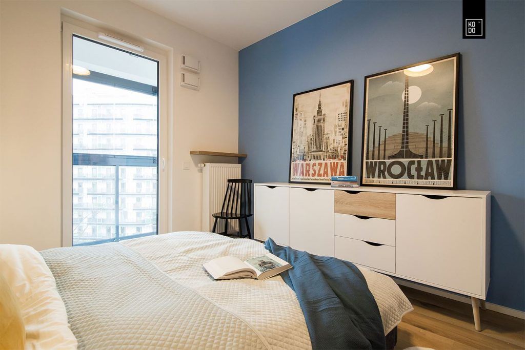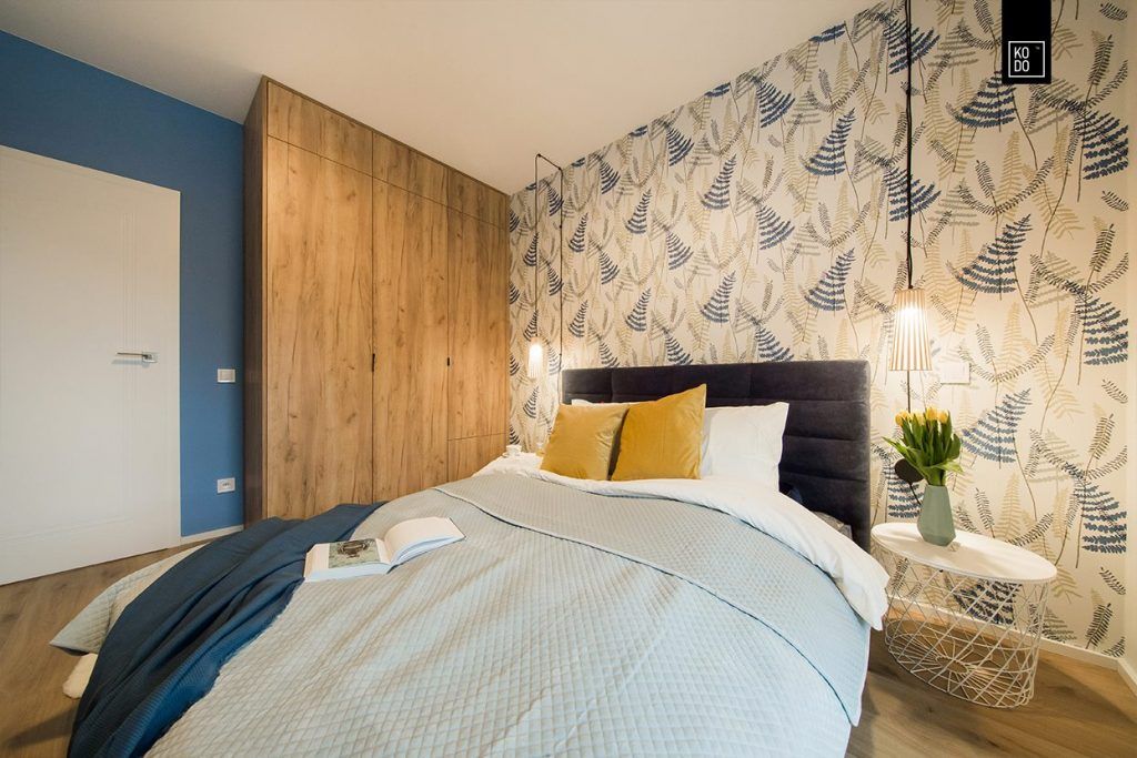 Daca in zona de zi avem culori vibrante si multe energie, in dormitorul matrimonial lucrurile se mai calmeaza putin. Albastrul folosit pentru pereti este mai sters iar culoarea lemnului pastreaza un ambient relaxant potrivit unei zone de noapte. Nici peretele accent nu este incarcat de culori, tocmai pentru a mentine aceasta atmosfera relaxanta.