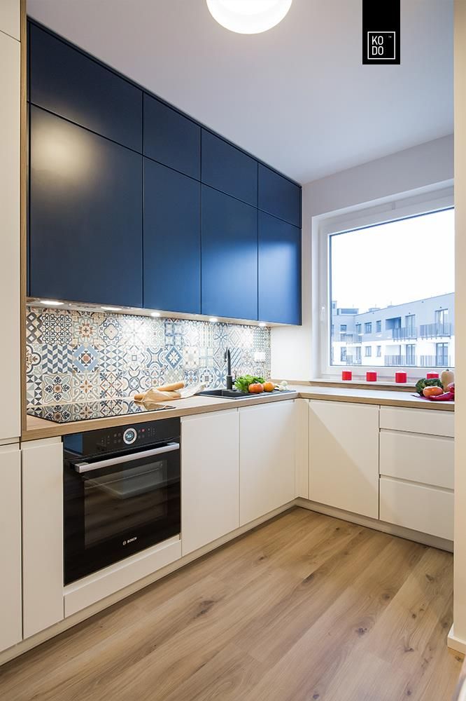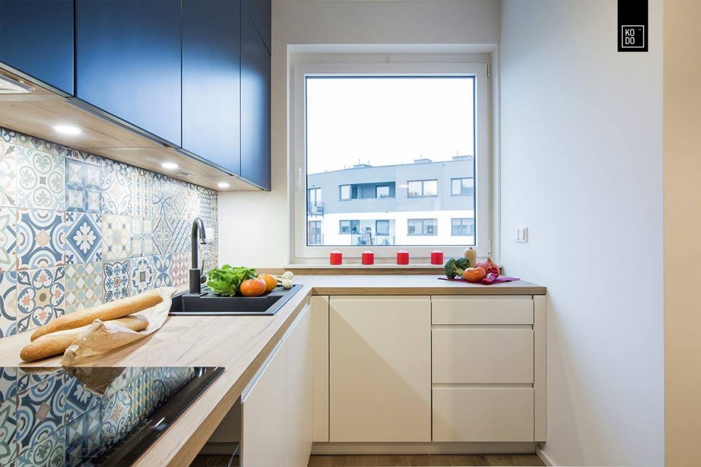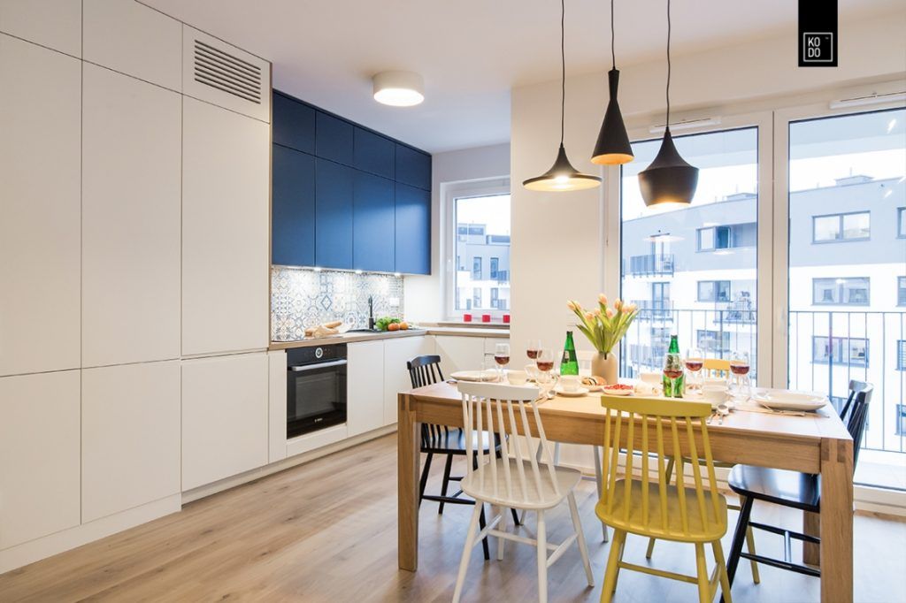 Bucataria este dispusa sub forma literei L si vine ca o prelungire a zonei de zi. Corpurile principale de mobilier au un design minimalist iar electrocasnicele au fost incorporate pentru a pastra unitatea vizuala, inclusiv frigiderul. Aici monotonia a fost sparta de albastrul folosit la corpurile suspendate. Spatiul se bucura si de multa lumina naturala datorita ferestrei existente.