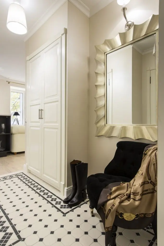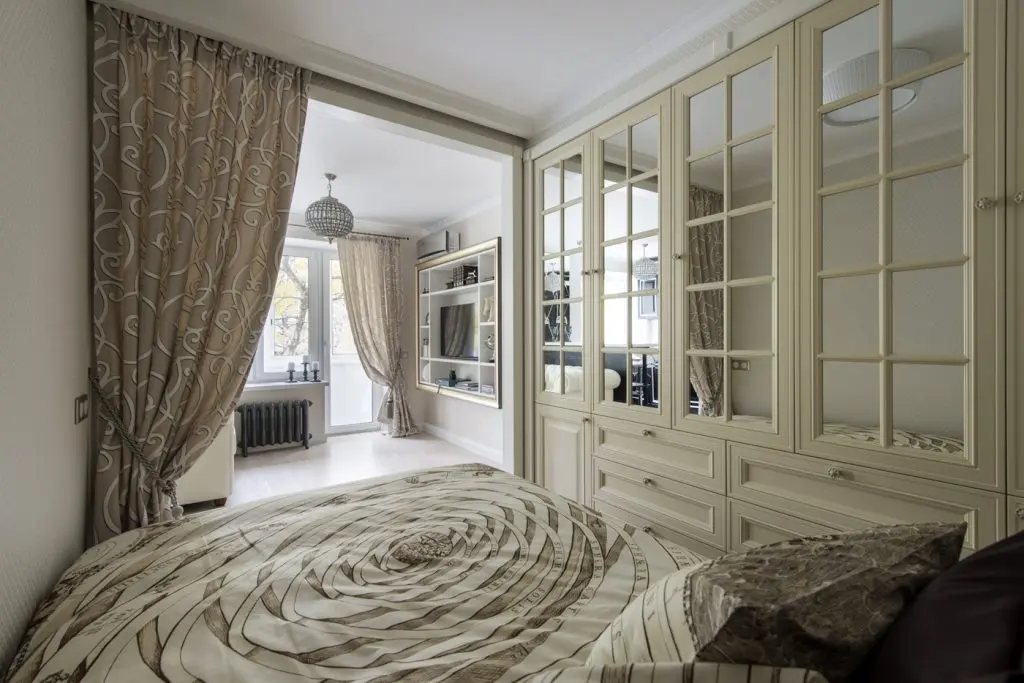 Observam totodata ca dormitorul si livingul sunt separate ingenios de o draperie, care, in perspectiva o completeaza pe cea din ferestra balconului un artificiu de design interior inteligent si foarte de efect. Baia imaculata si holul din care nu lipsesc oglinda generoasa si o garderoba inserata in perete completeaza aceasta amenajare luxurianta.