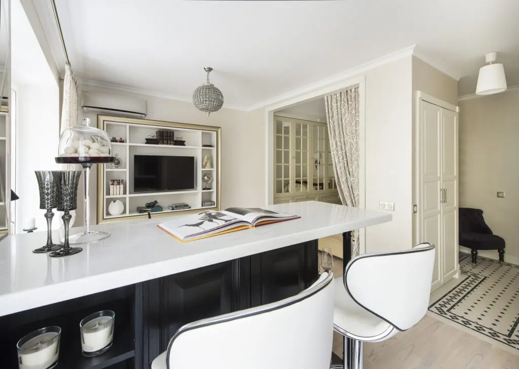 S-a lucrat pe baza contrastului primar, cel in care luxul transpare cel mai bine. Paleta de nuante crem, pasteluri diluate, alb cremos si tonuri naturale creeaza o atmosfera calda, placuta. Pentru delimitare au fost folosite tusele negre mobilierul inchis al bucatariei bine utilate marcheaza zona de gatit, iar barul gri deschide zona livingului. Asa cum se observa, barul a primit functie dubla, el intrunind si calitatile unui spatiu de dining foarte sic.