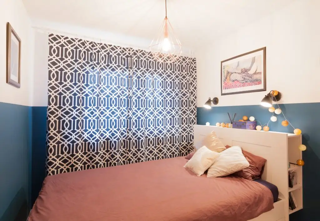 Pentru dormitor, amenajarea urmeaza aceeasi linie minimala, in acest caz limitata de dimensiunile reduse ale incaperii. Cu toate acestea, s-a putut integra un pat cu tablie ce incorporeaza mici zone de depozitare si dulapuri pentru haine. De jur imprejurul patului, peretii au fost zugraviti pe jumatate cu un albastru placut menit sa distraga atentia de la spatiul mic existent.