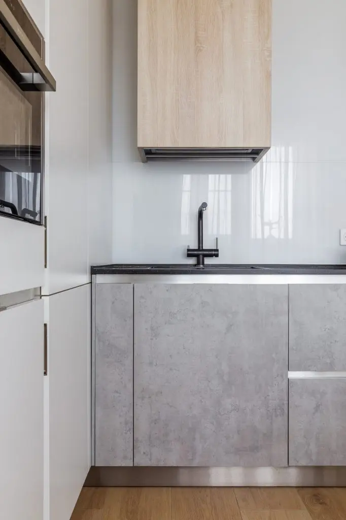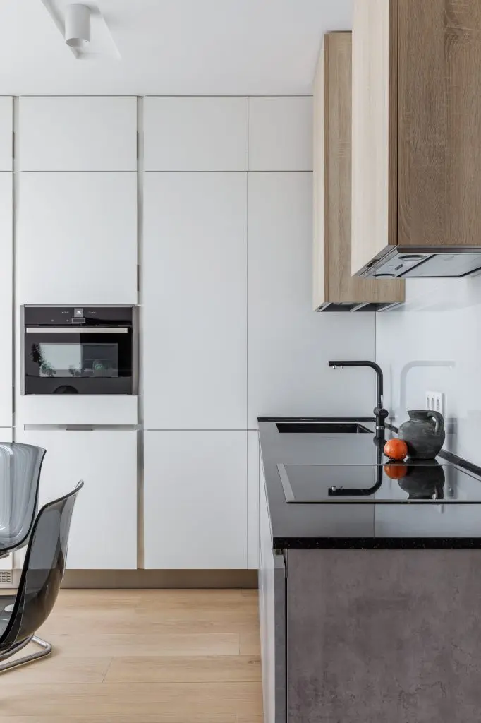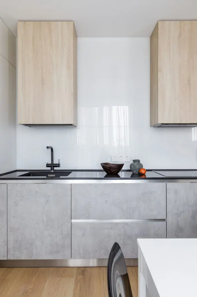Jocul de texturi utilizat aici creioneaza o atmosfera calma si stilata. Usile mobilierului de sub blat au o textura de beton aparent in timp ce corpurile de deasupra, care se prelungesc elegant pana in tavan, sunt realizate din placi cu textura de lemn natur. Pentru peretele de deasupra blatului designerii au optat pentru o placare cu sticla alba.