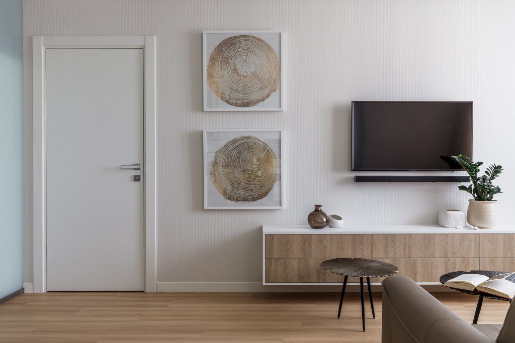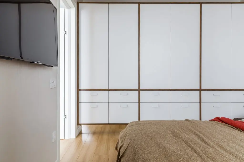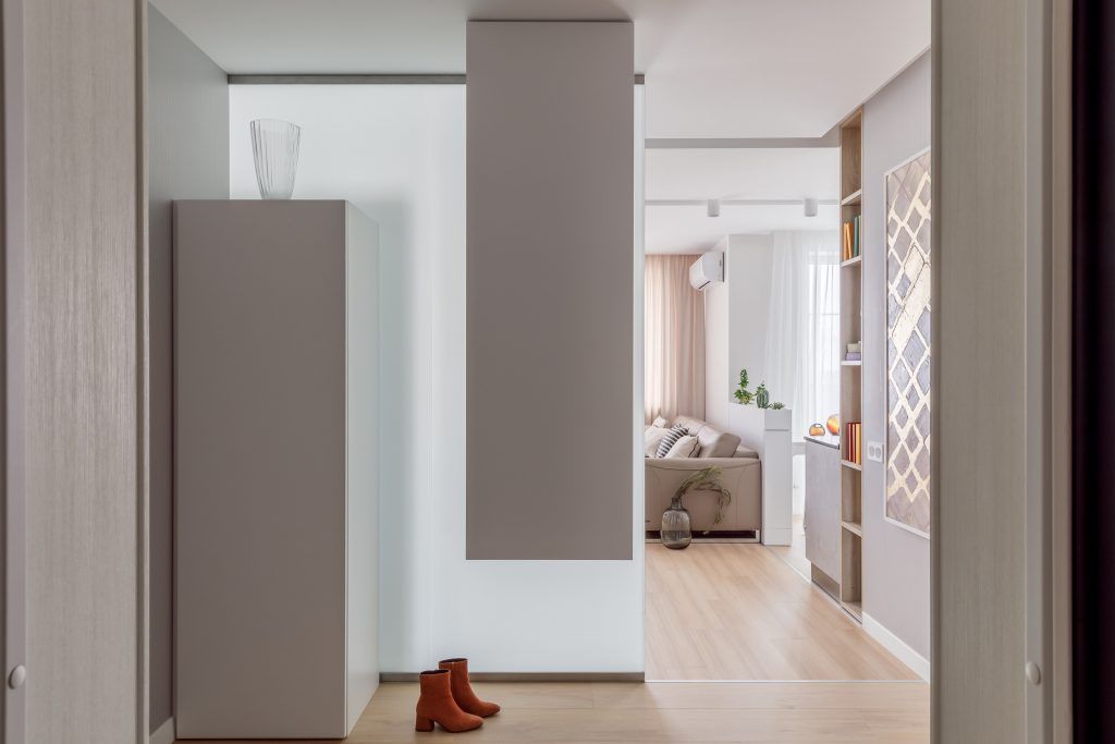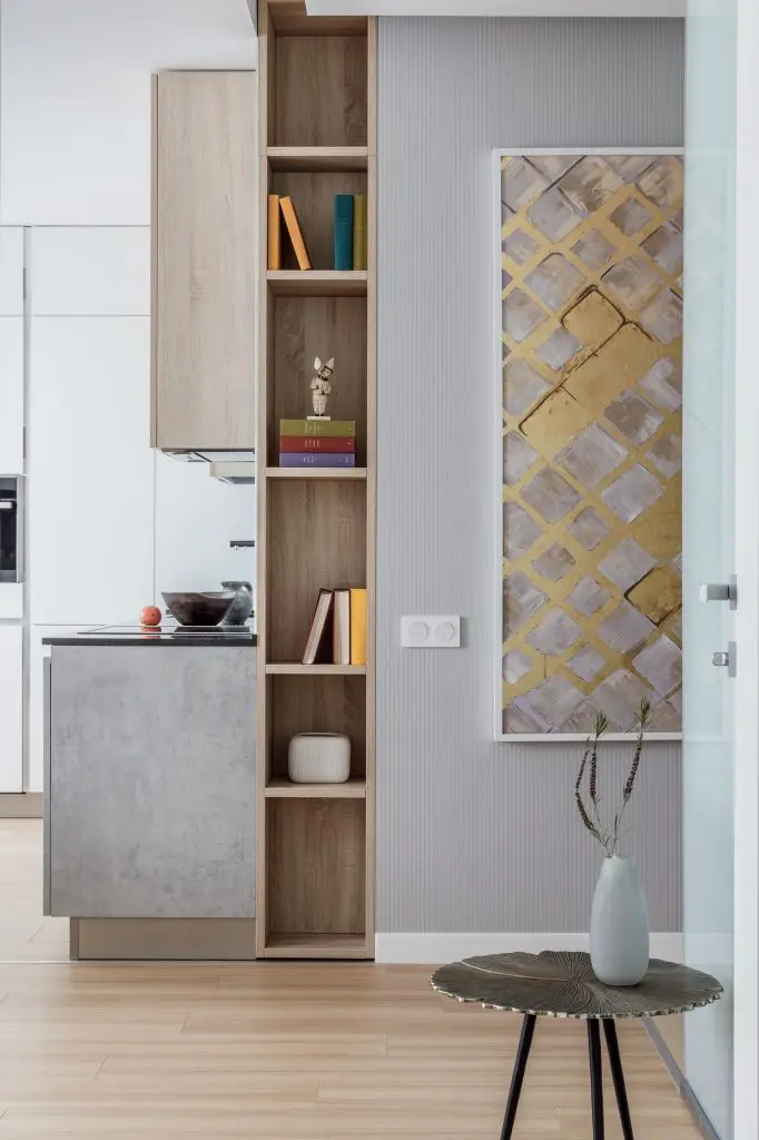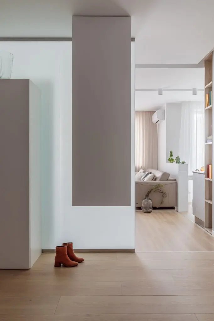 Spatiile de depozitare, extrem de importante in orice locuinta, mai ales intr-un apartament mic, au fost tratate ca obiecte de arta, avand astfel un dublu rol in cadrul amenajarii.