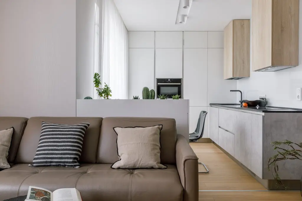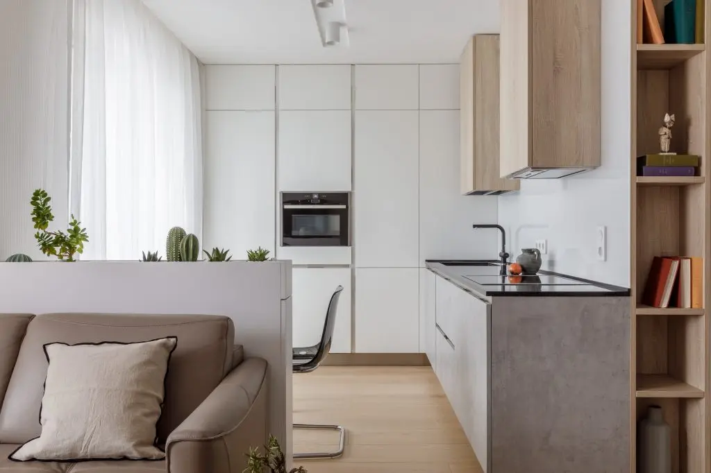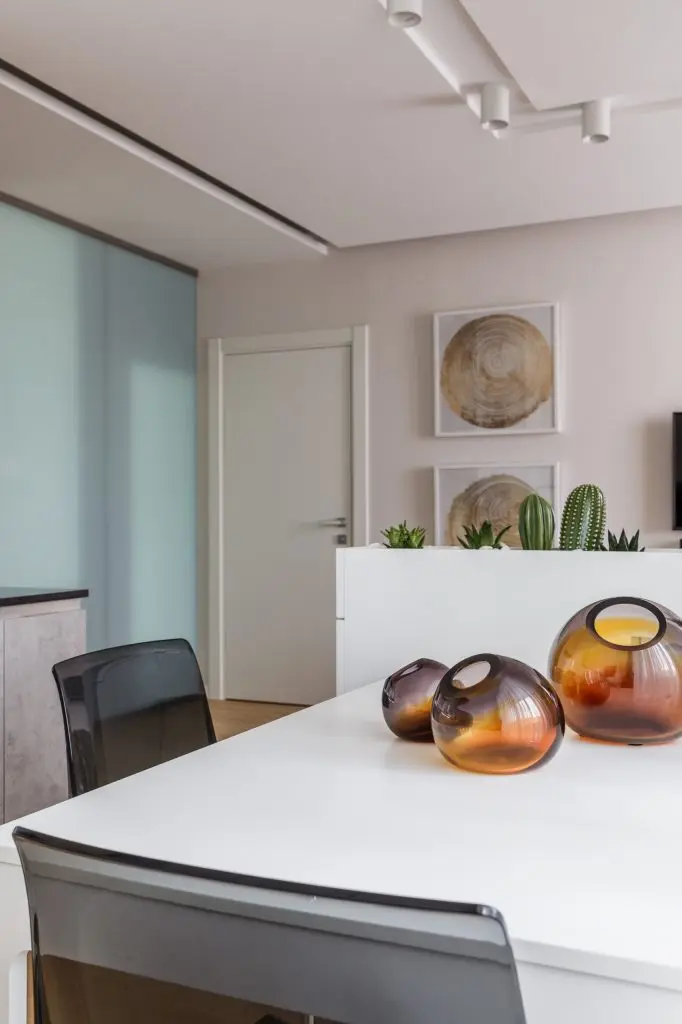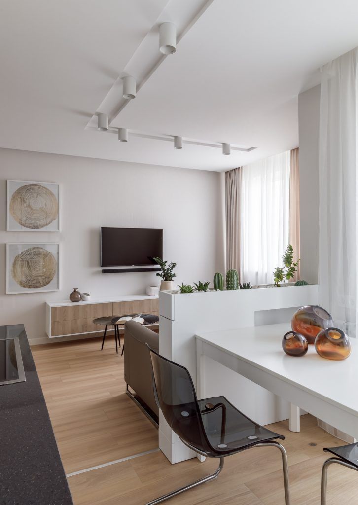 O mini oaza de vegetatie, integrata ingenios in amenajarea zonei de zi, are rolul de a separa livingul de bucatarie si in acelasi timp ascunde prezenta unui dulap incastrat.