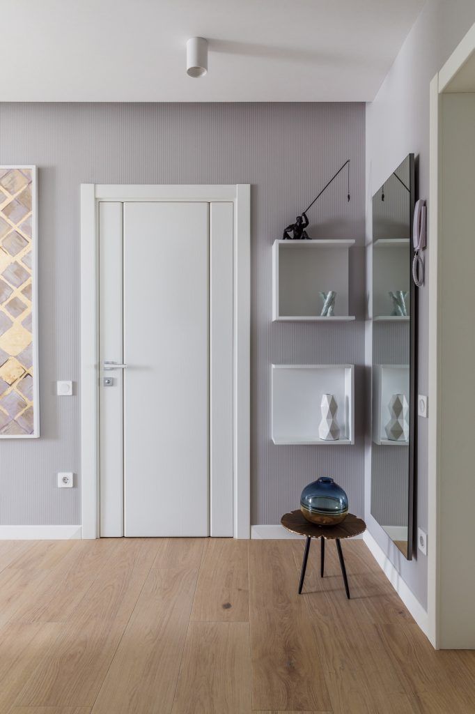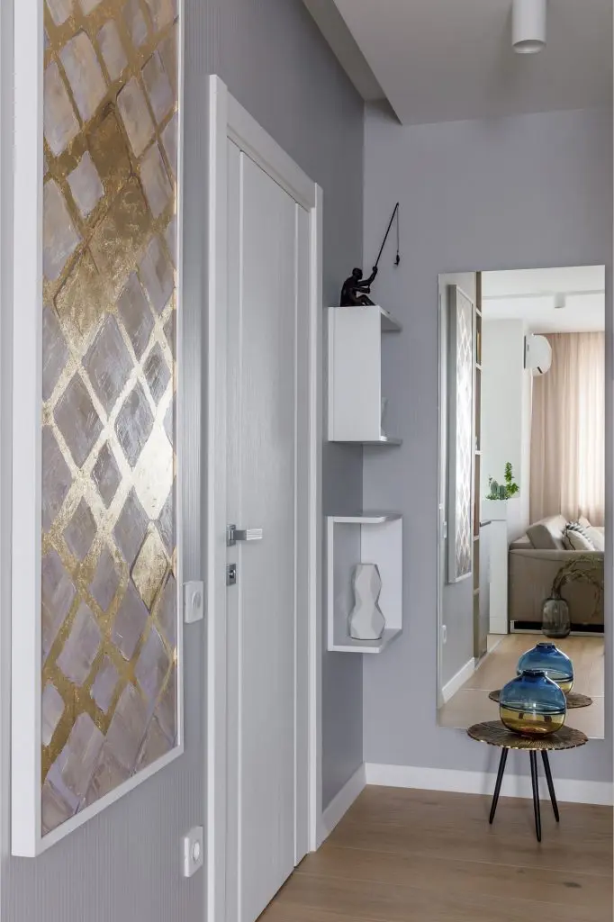 Textura riflata a tapetului propus pentru peretii din zona de zi si hol, impreuna cu nuanta pastelata folosita, asigura caracterul special al locuintei.