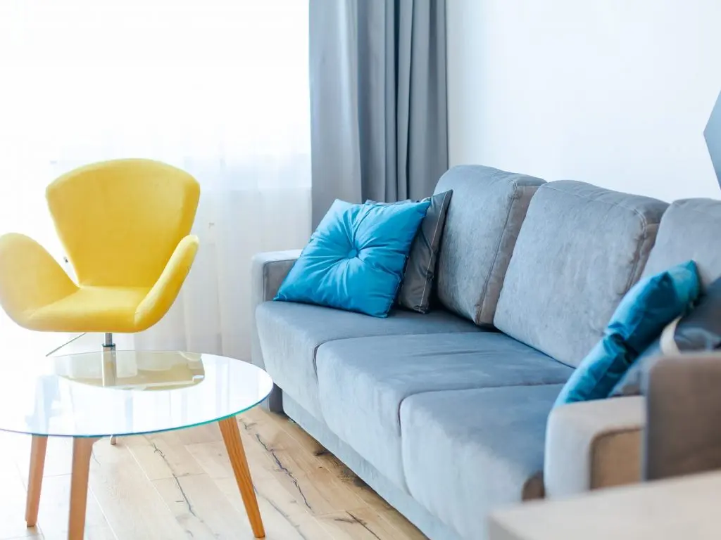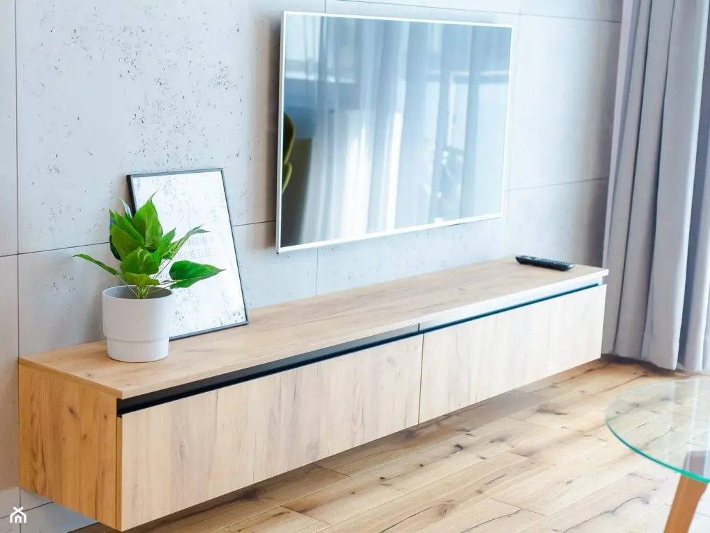Livingul urmeaza un design minimal si este compus dintr-o canapea extensibila, asortata cu perne decorative, o masuta de cafea cu blatul de sticla, o comoda si un fotoliu. Micile detalii decorative ajuta la o personalizare discreta, cum ar fi tabloul, ghiveciul, pernele si draperiile. Folosirea lemnului si a albului reusesc sa contureze un spatiu luminos cu finisaje moderne.