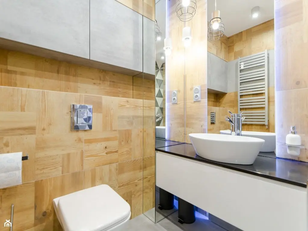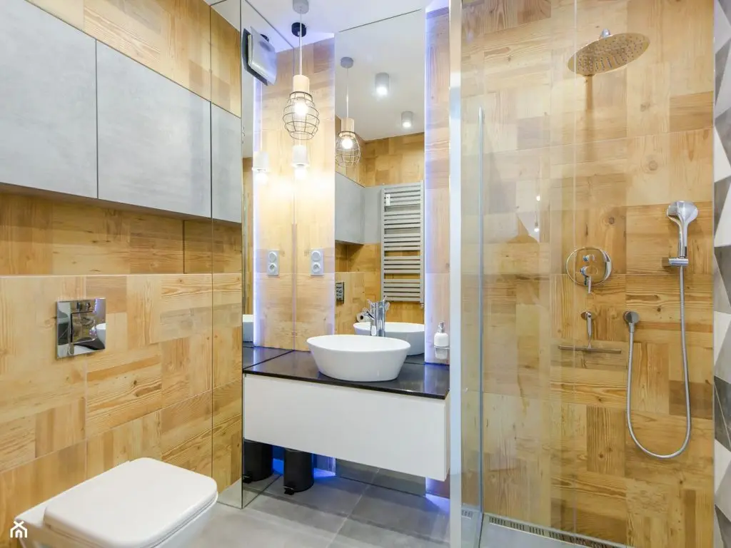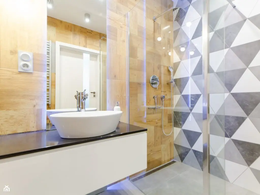 Pentru baie s-a optat pentru un dus de tip walk-in, ideal pentru spatiile mici. Din punct de vedere cromatic, aceasta vine cu o imagine calda, emanata de nuanta placilor de gresie ce imita lemnul. Tema geometrica prezenta in bucatarie se ragaseste si aici, reusind sa accentueze atmosfera moderna.