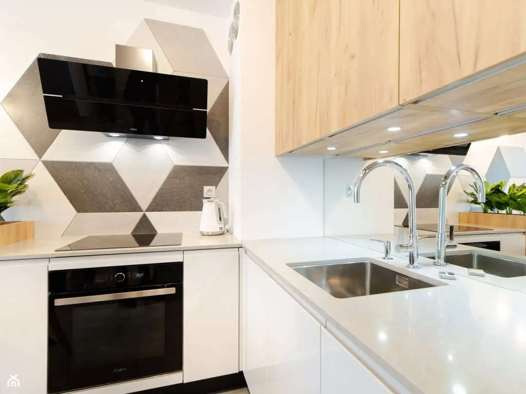 In bucatarie regasim un spatiu bine optimizat, cu mobilier pe 2 laturi si electrocasnice incorporate pentru un plus de unitate vizuala. Corpurile suspendate cu finisaje de lemn reusesc sa sparga din monotonia impusa de folosirea albului si a griului. Un element inedit pe care l-am regasit aici este reprezentat de folosirea unei oglinzi intre blat si corpurile suspendate, care adauga un plus de eleganta intregului ansamblu.