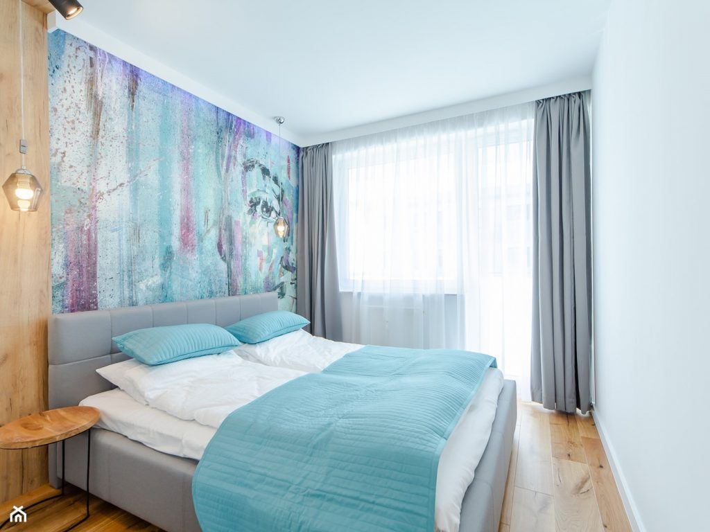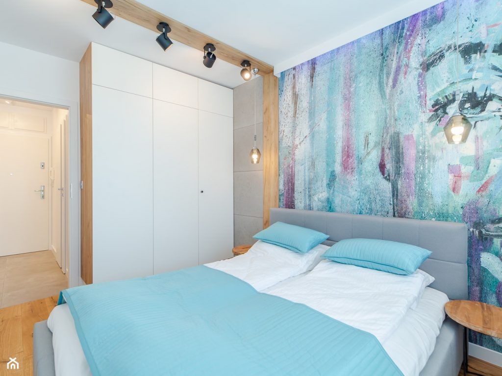 In dormitor regasim aceeasi abordare minimalista, avand ca piesa principala un pat dublu. Chiar daca spatiul este mic, amenajarea asigura confortul necesar, fara a aglomera incaperea. Punctul de interes al camerei este reprezentat de peretele accent care dinamizeaza intregul decor.