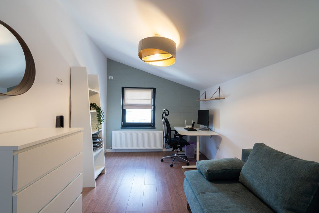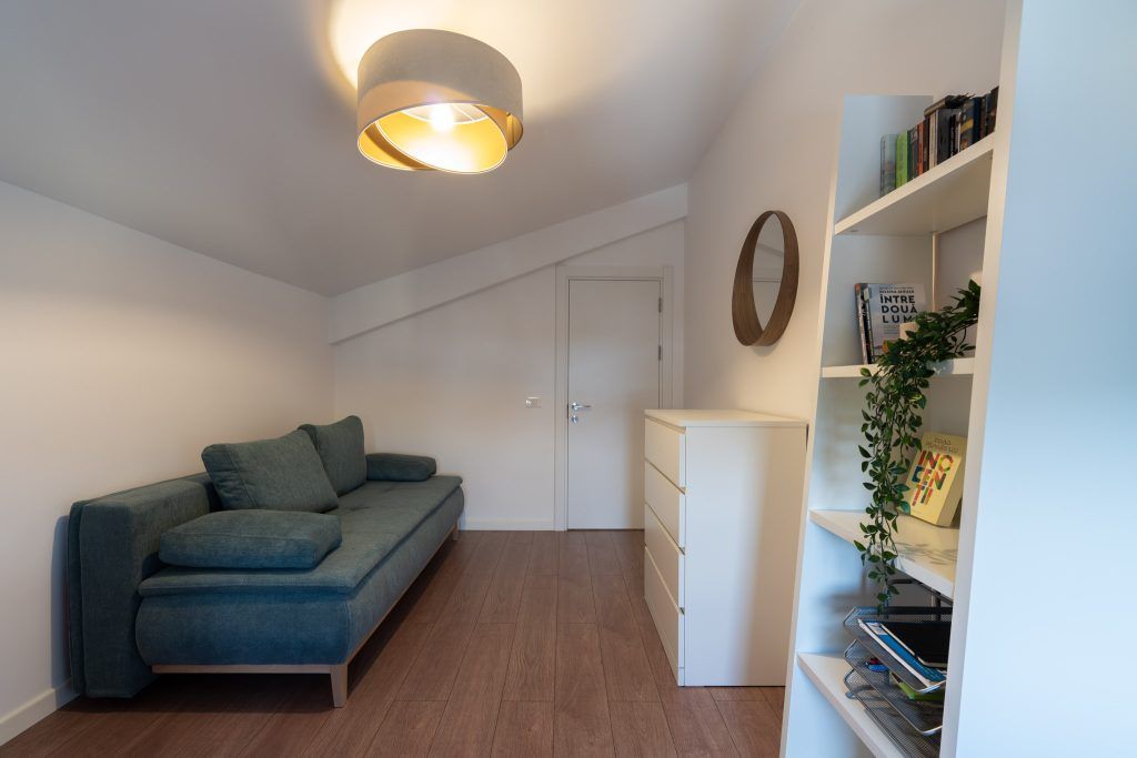 Cele doua birouri de la mansarda au fost tratate diferit; unul din ele are si rolul de camera de oaspeti, avand o canapea extensibila si depozitare pentru haine.