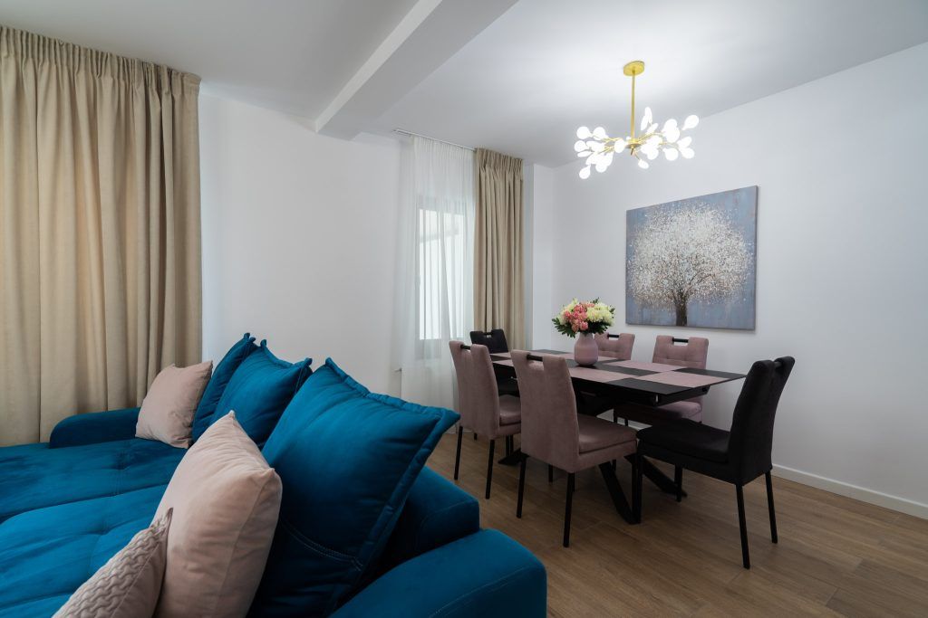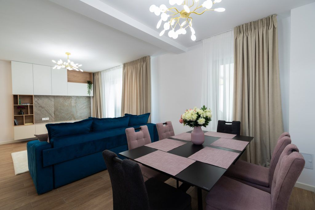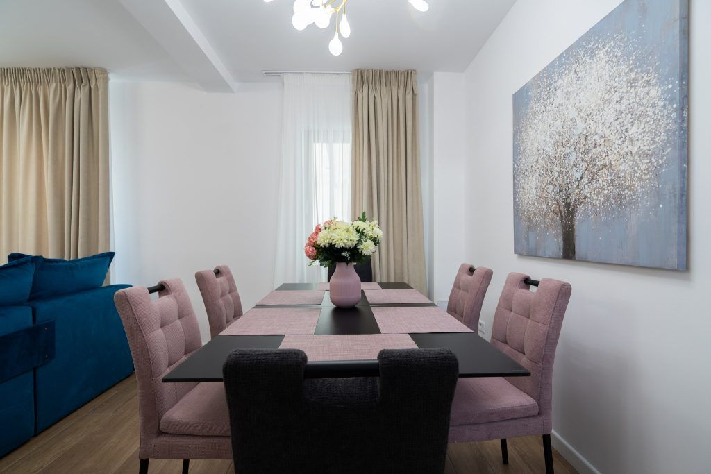 “Zona de dining este formată dintr-o masa extensibila din sticla neagra, cu scaune catifelate si comode. Am folosit acelasi corp de iluminat atat in living, cat si in dining, pentru unitate vizuala, mai exact lustre jucause cu petale, model care se regaseste si in tabloul de deasupra mesei.”