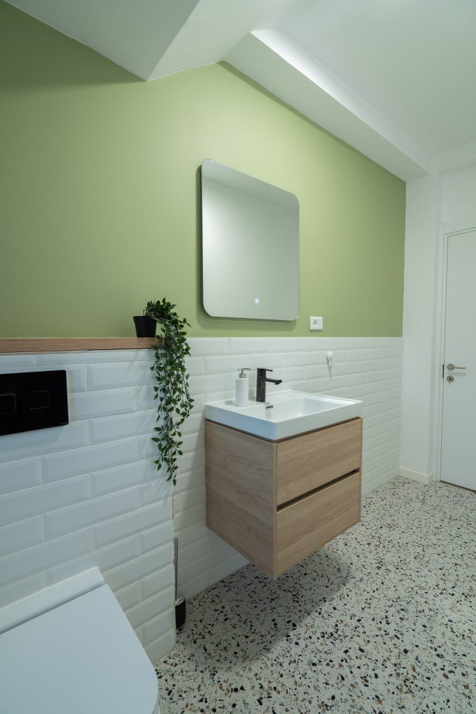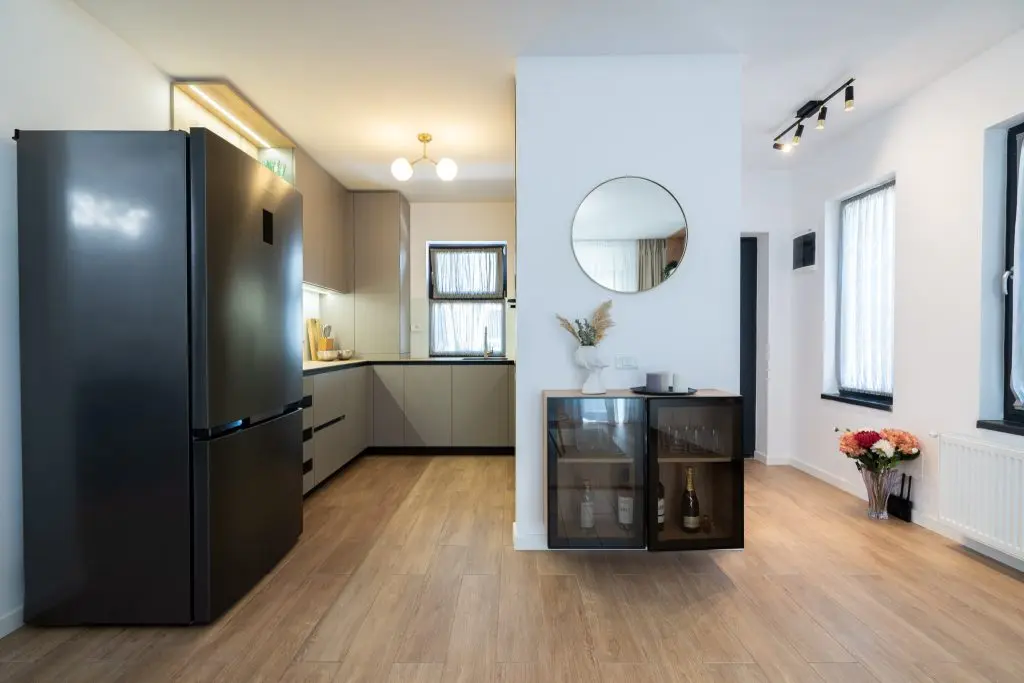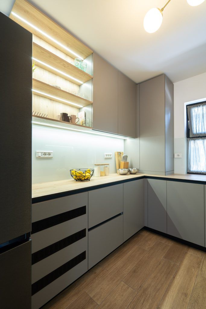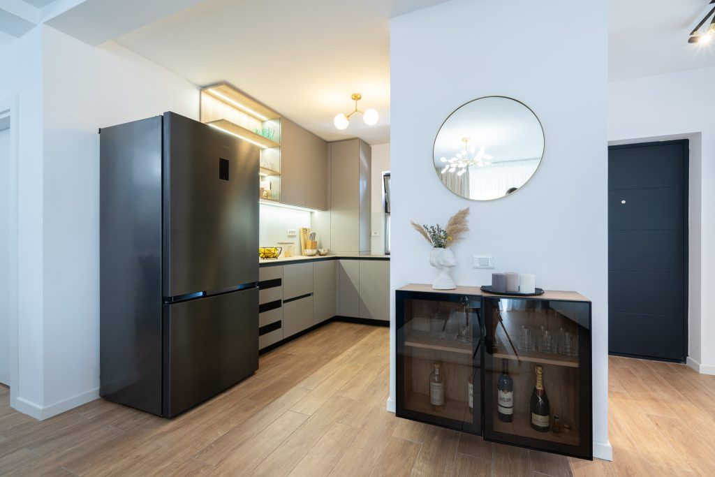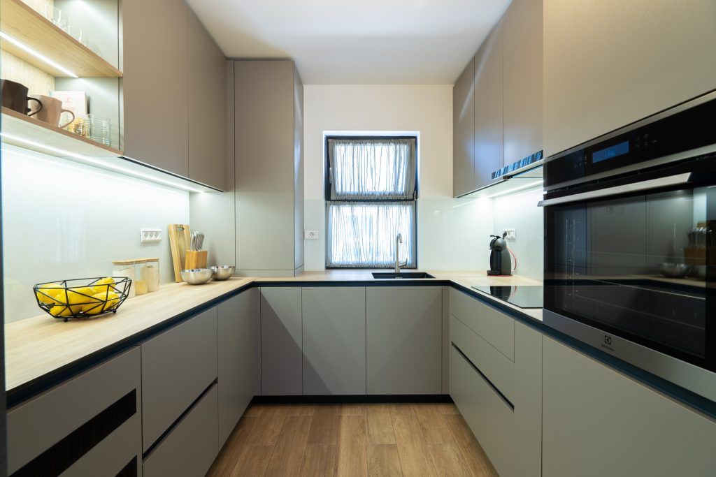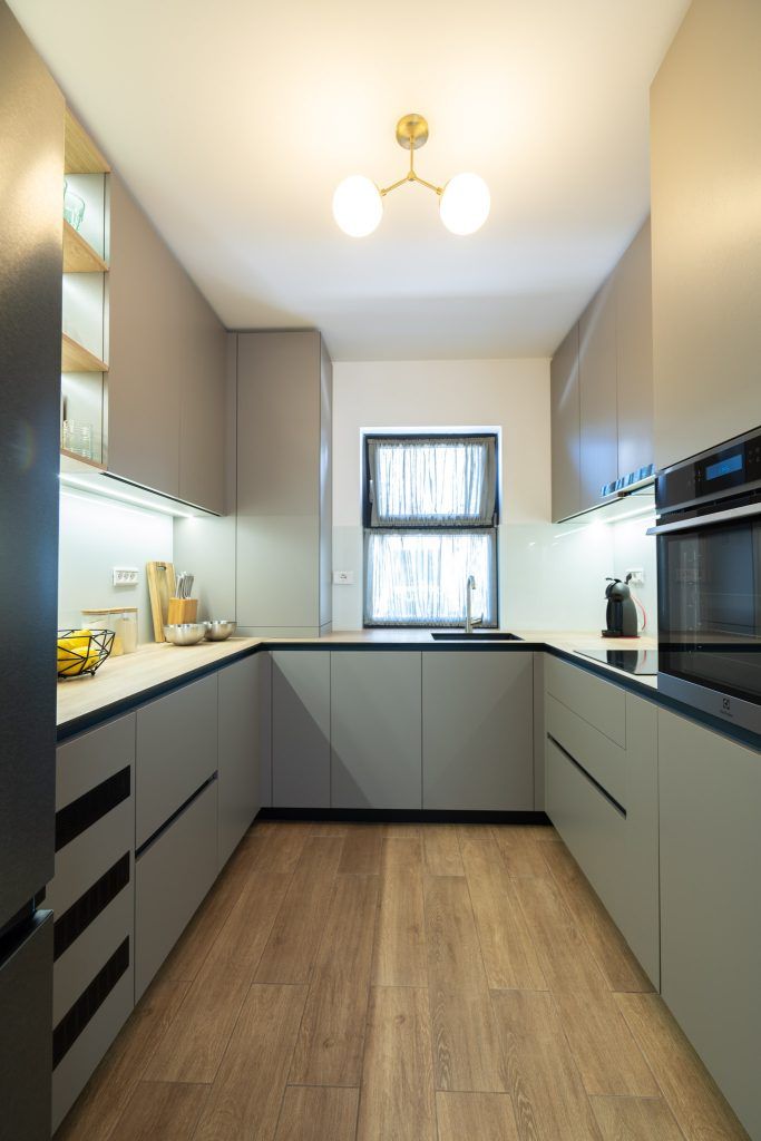 Mobilierul din bucataria a fost realizat integral la comanda ( Bismobil) intr-o nuanta deschisa de verde-gri si accentele de negru date de electrocasnice. Dispus in forma de U, mobilierul mascheaza intr-un corp inalt si centrala termica , dar si o zona de depozitare a legumelor (suplinind lipsa unei camari).