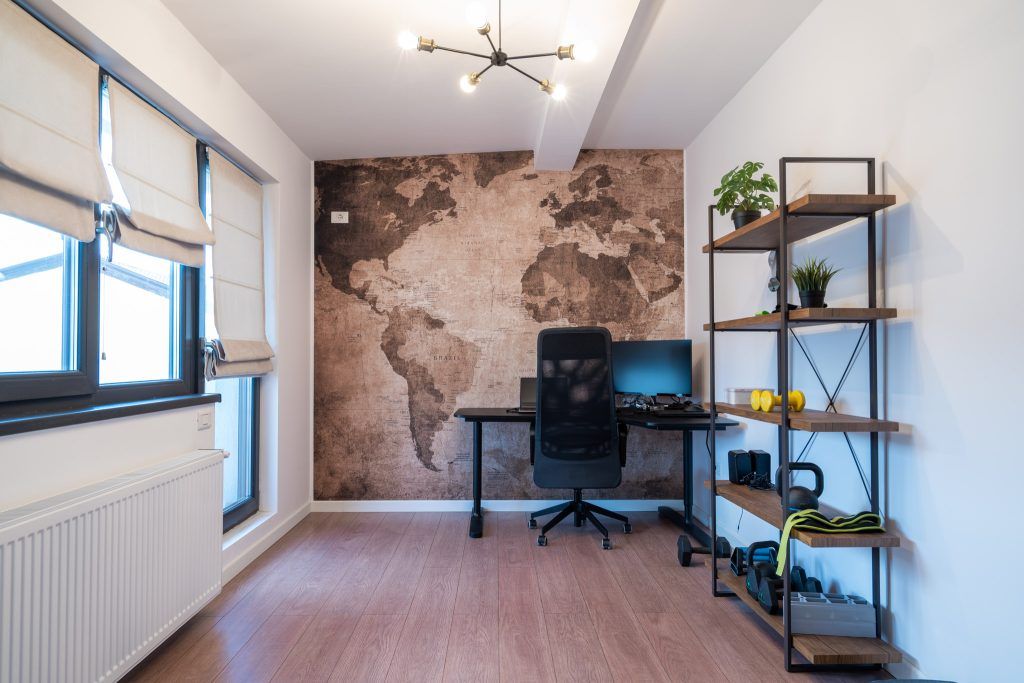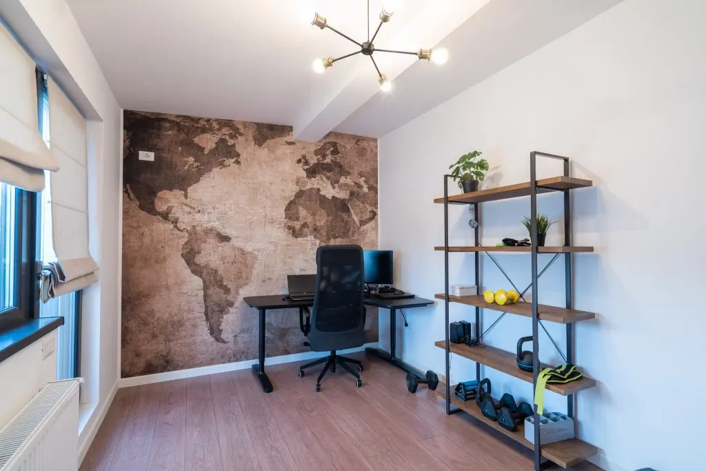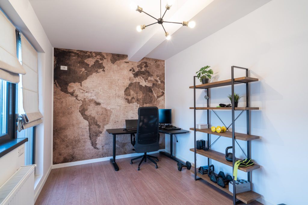 ”In prima camera am folosit un fototapet cu harta lumii, realizat pe dimensiunile peretelui si comandat de la The Home. Acest spatiu serveste si ca loc de facut exercitii, asadar am adaugat si niste rafturi deschise, din lemn cu structura metalica neagra.”